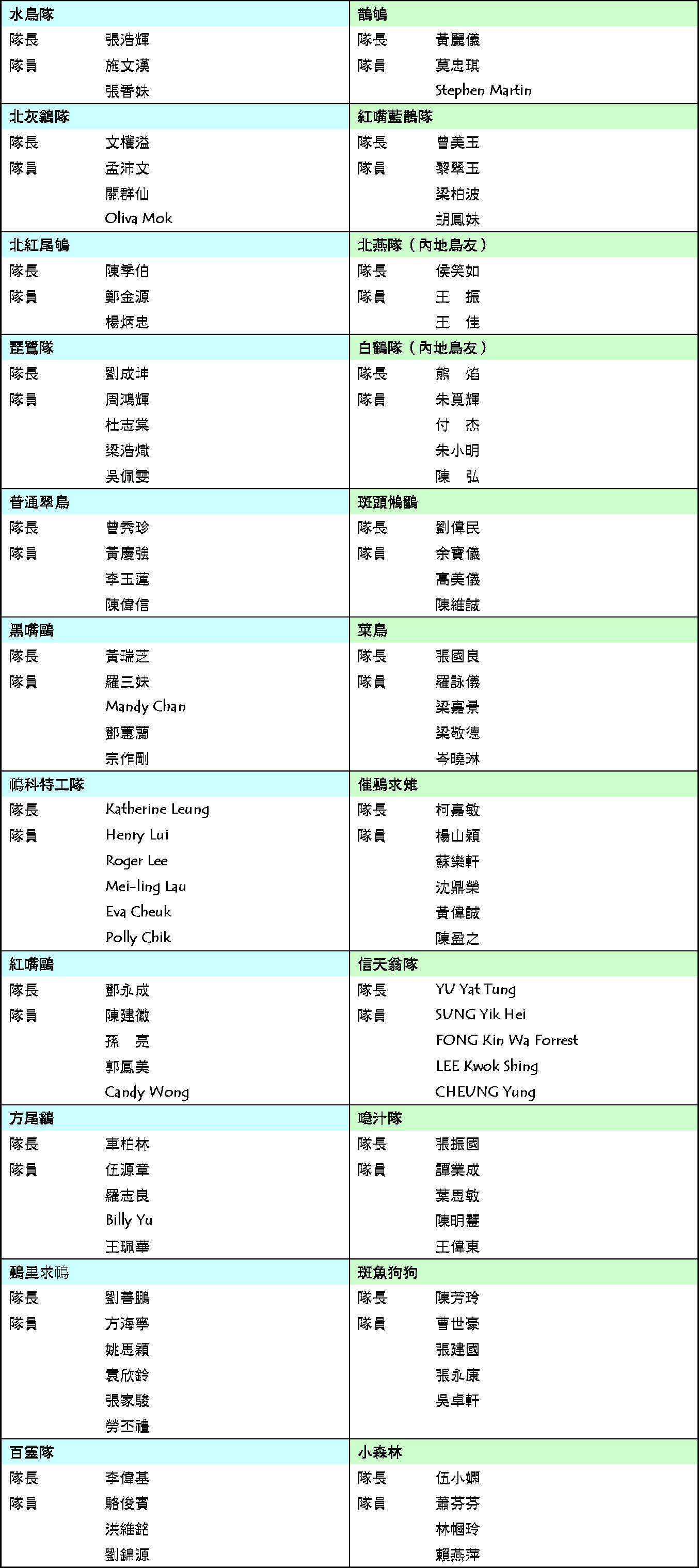 香港觀鳥大賽2010參賽名單 HK Bird Race 2010 List of Teams [30/3更新]