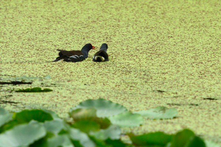 Two common moorhens emerged from a lily plantation in Long Valley on April 28th. The moorhen on the left lifted up its bill to utter low-winded garrulous talks to the moorhen on the right. It yacked all the way before disappeared behind the water weeds.
