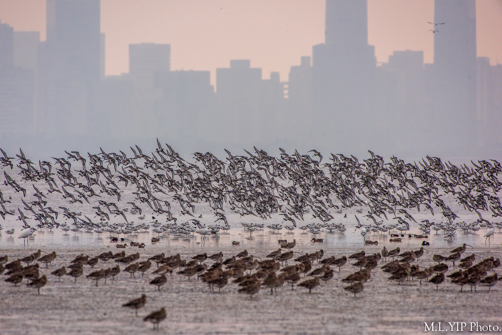 這群小鷸子密集地急速低空盤旋,塲面壯觀.