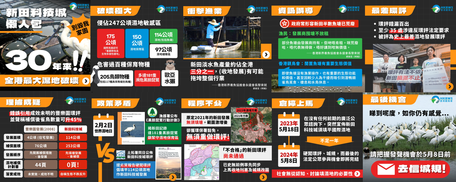 【疑曲解國家政策 合理化填塘方案】2023年8月國務院公佈的《河套深港科技創新合作區深圳園區發展規劃》,明確指出「河套深港科技創新合作區」香港園區具體面積為87公頃,面積與落馬洲河套區的「港深科技園」吻合。反之,具指導意義的《粵港澳大灣區發展規劃綱要》,就明確提出「加強濕地保護修復,全面保護區域內國際和國家重要濕地,開展濱海濕地跨境聯合保護」。局方似乎選擇性解讀國策,忽略新田科技城填平濕地與國家濕地保護策略相沖的事實。局方認真看待《十四五規劃》及《粵港澳大灣區發展規劃綱要》的生態環境保育條文。
