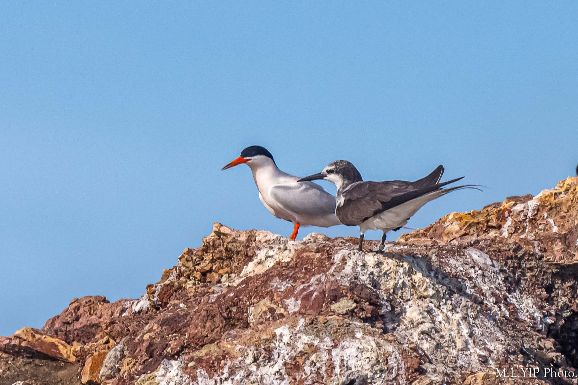 右邊的褐翅燕鷗,似乎有腳環,但不見足旗.