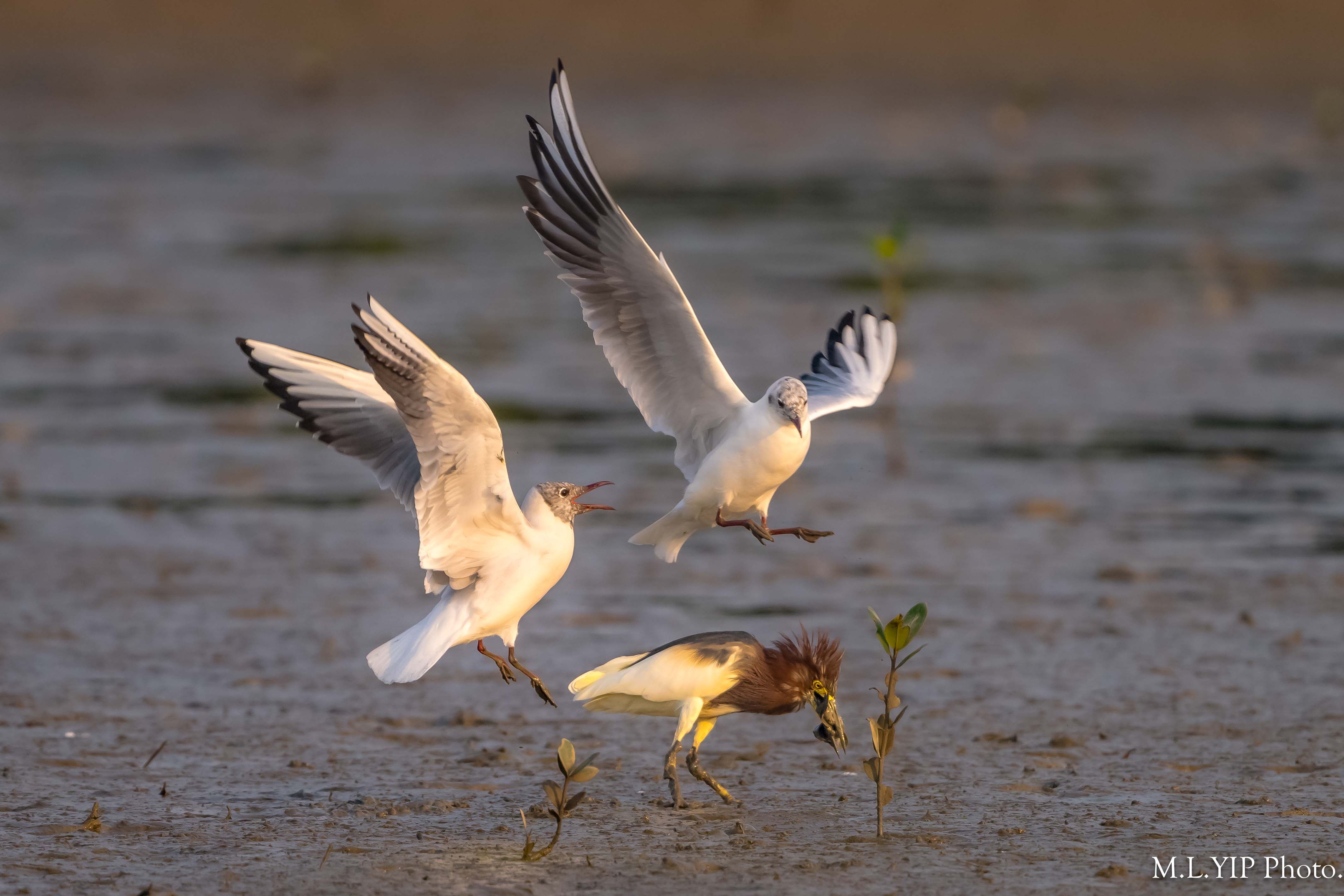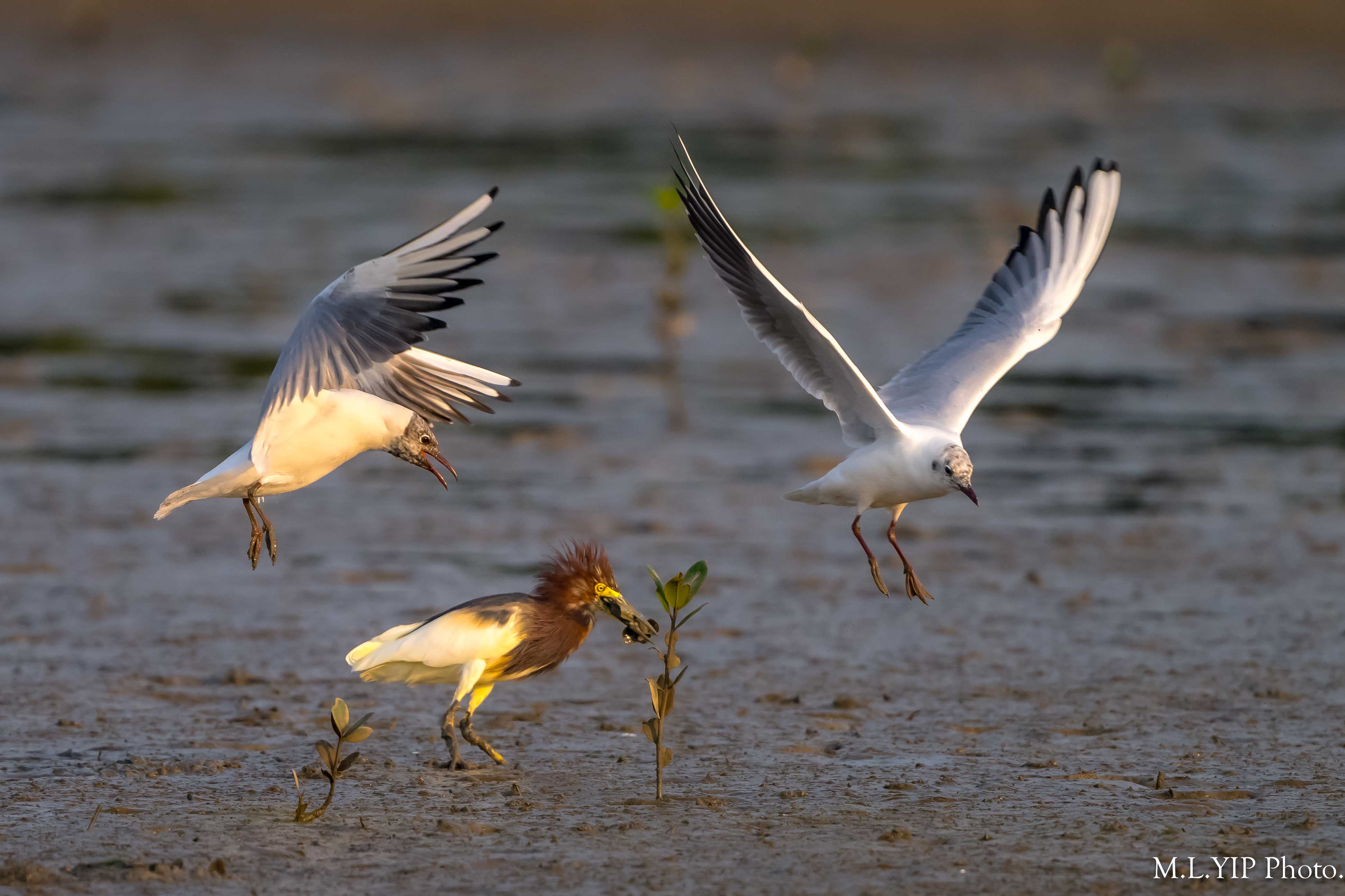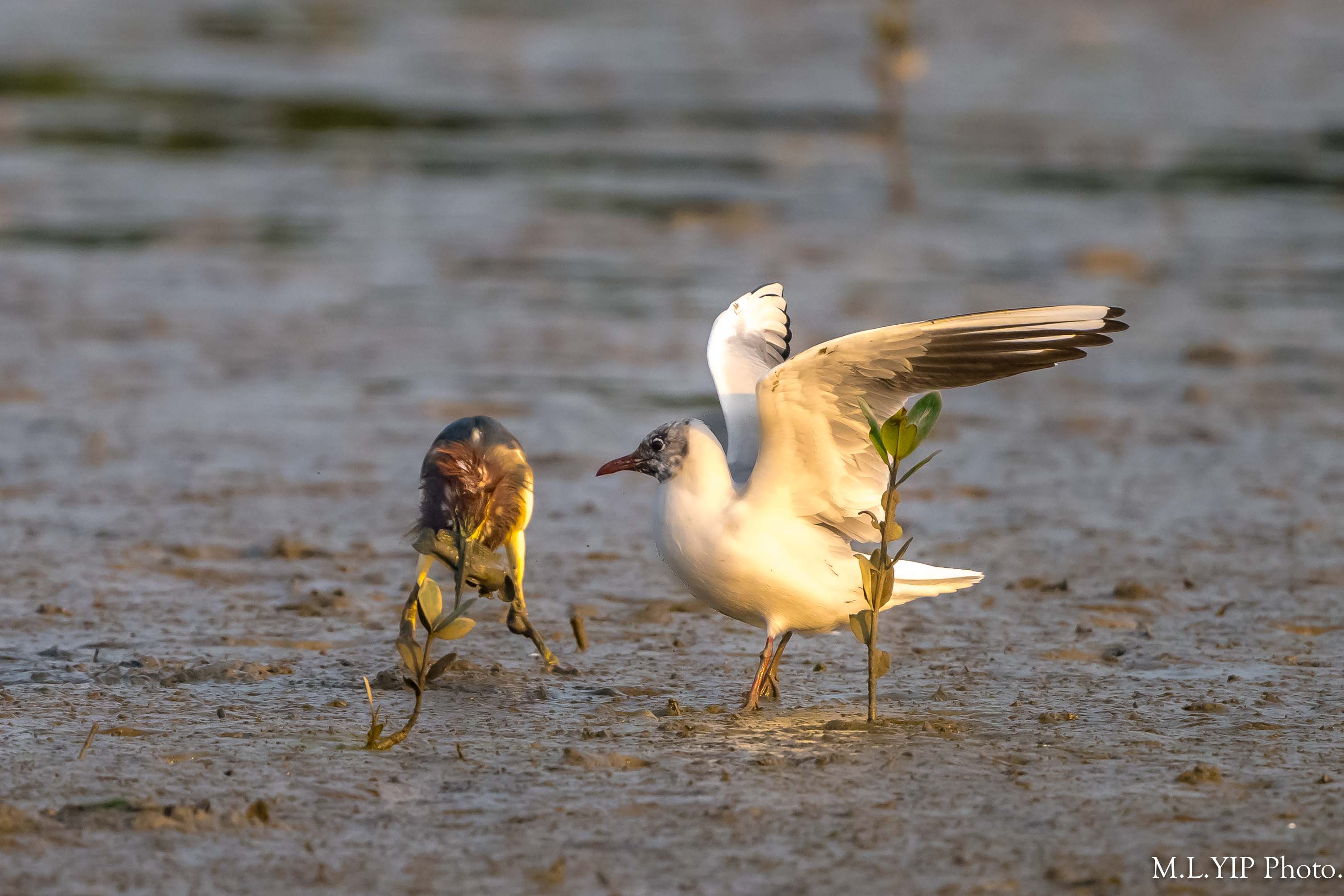 池鷺捉到魚,這隻紅嘴鷗馬上走近,但祇係望住,沒有搶.
