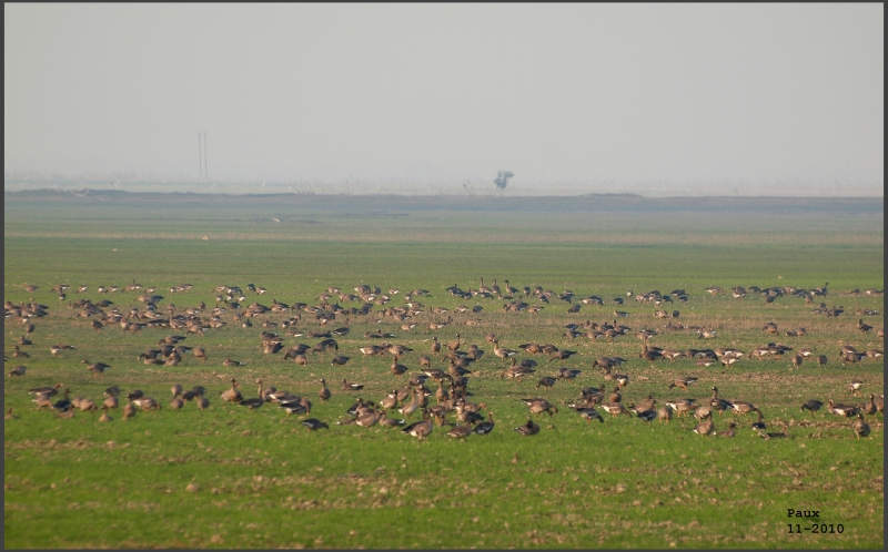 Interesting pictures of the geese. The birds at the back look like Bean Geese. Plumage and structure looks most like Tundra (serrirostris) but they seem to be very big, larger than the White-fronted. Perhaps these could be similar to the confusing 'large serrirostris' that was in the group at Mai Po recently. Do you have any more photos of these or other Bean Geese from your trip?