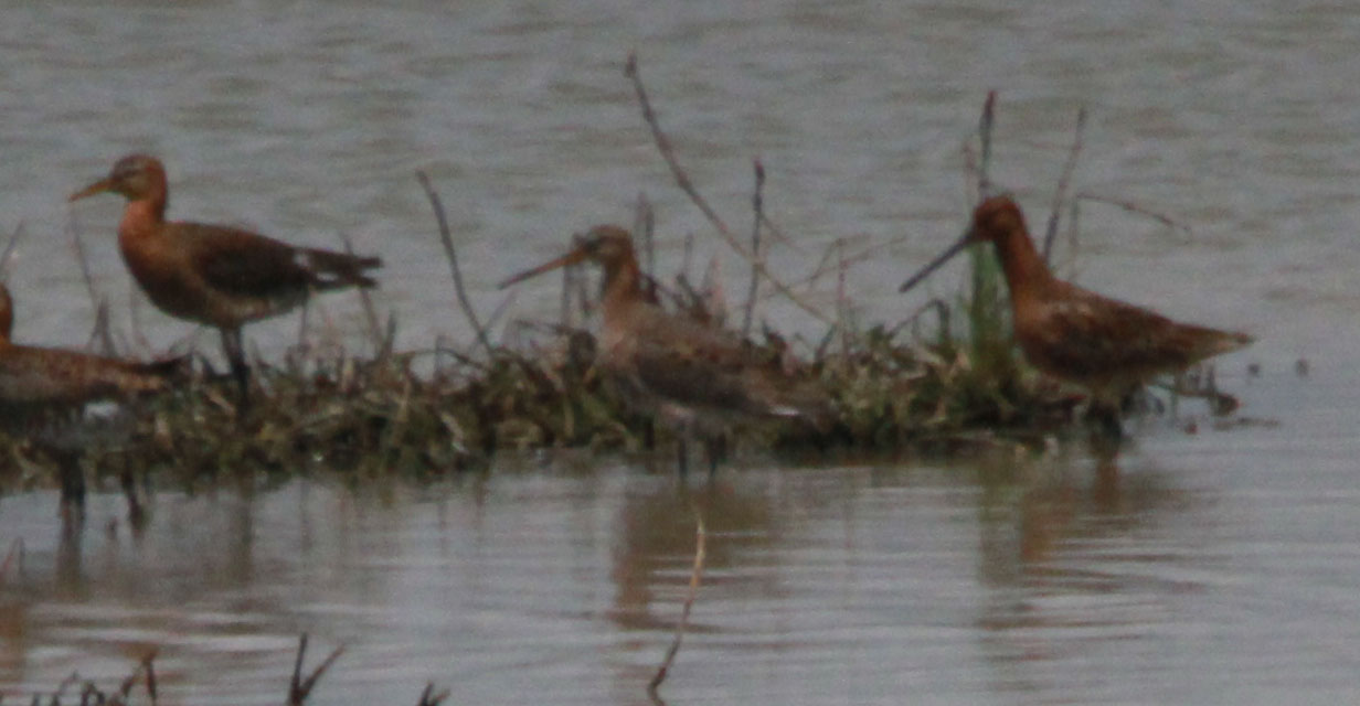 The reddest bird, on the right, is an Asian Dowitcher - note the very dark grey (if not in fact, blackish) rather tubular bill, deeper at the base.