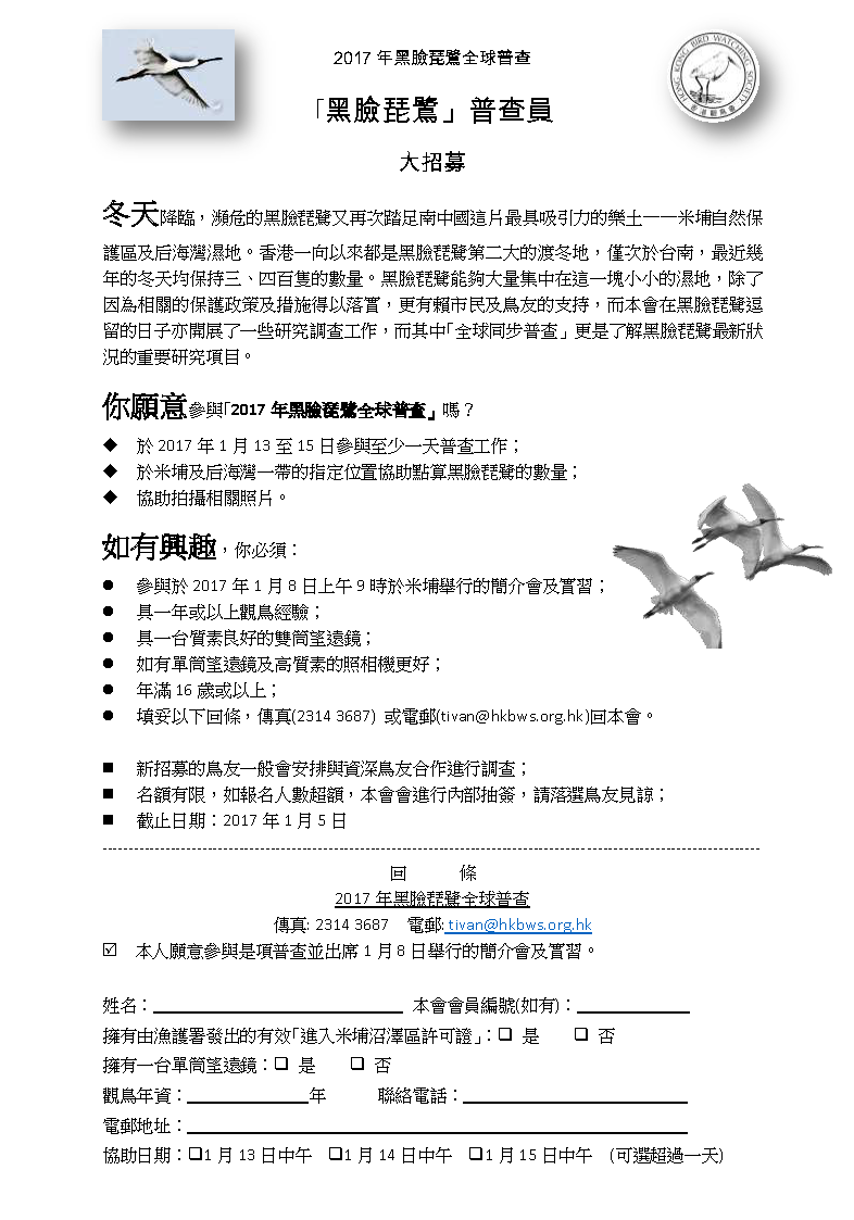 2017年黑臉琵鷺全球普查 Intl BFS Census - 普查員大招募 Recruitment