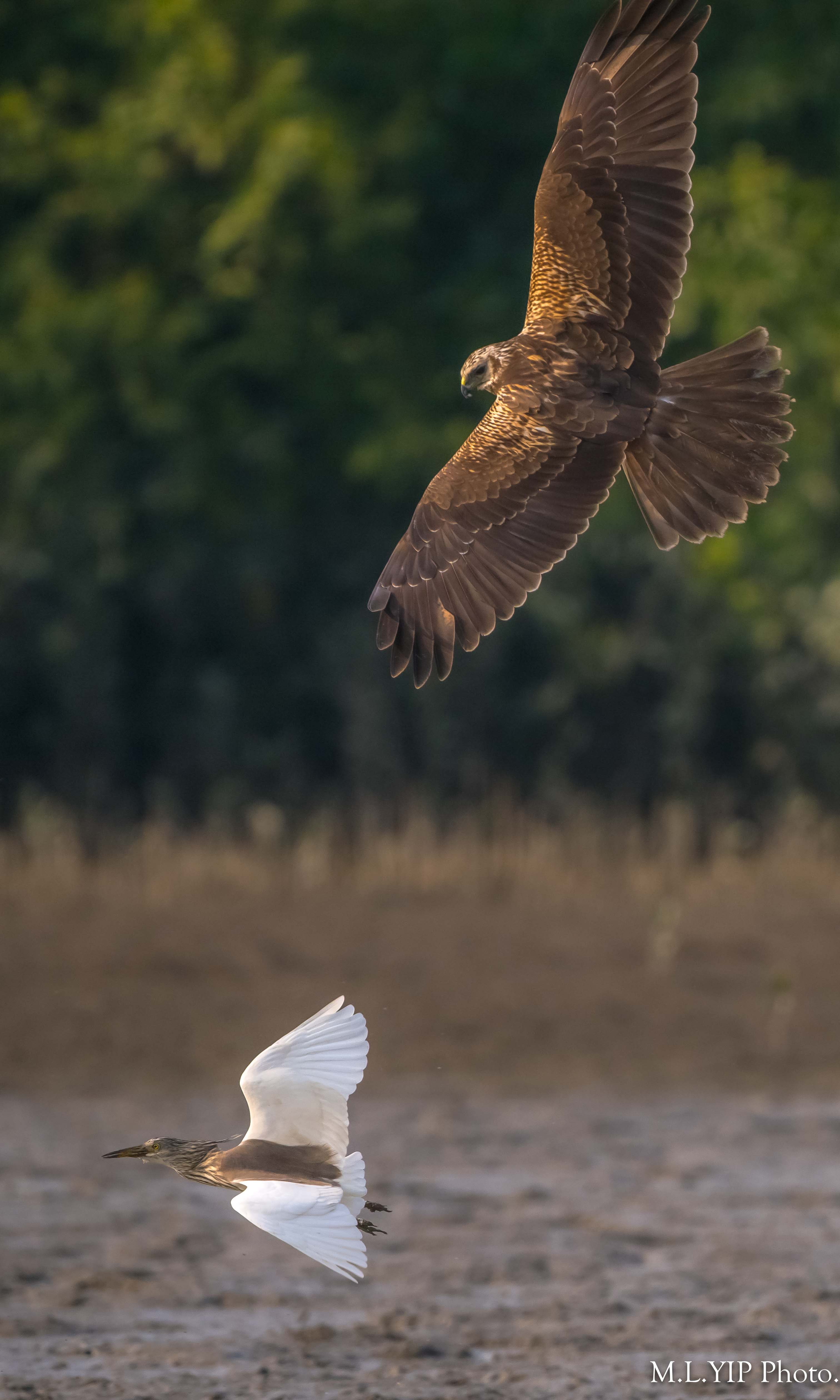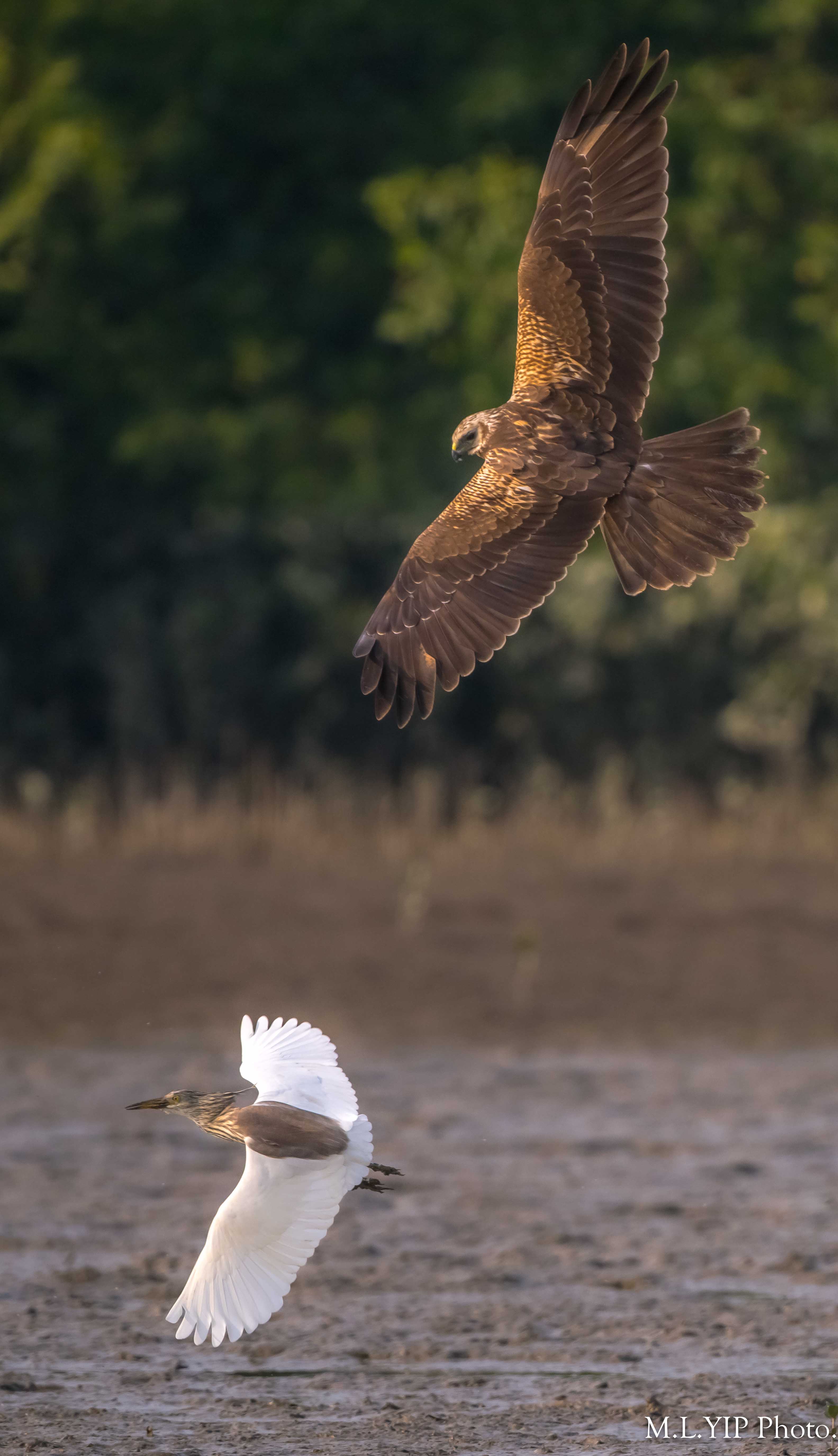 橫空突然出現一隻白腹鷂,直撲泥灘上的一隻池鷺,幸好池鷺反應也敏捷,逃過了一劫.