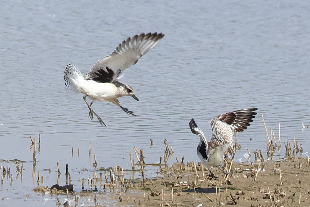 偶見兩灰斑鴴互毆,頗為有趣.主攻者凌空跳起,再俯身而下,甚有氣勢,主守者穩站地上,待主攻者落地,才出手擊中主攻者頭部,令對方落荒而逃.