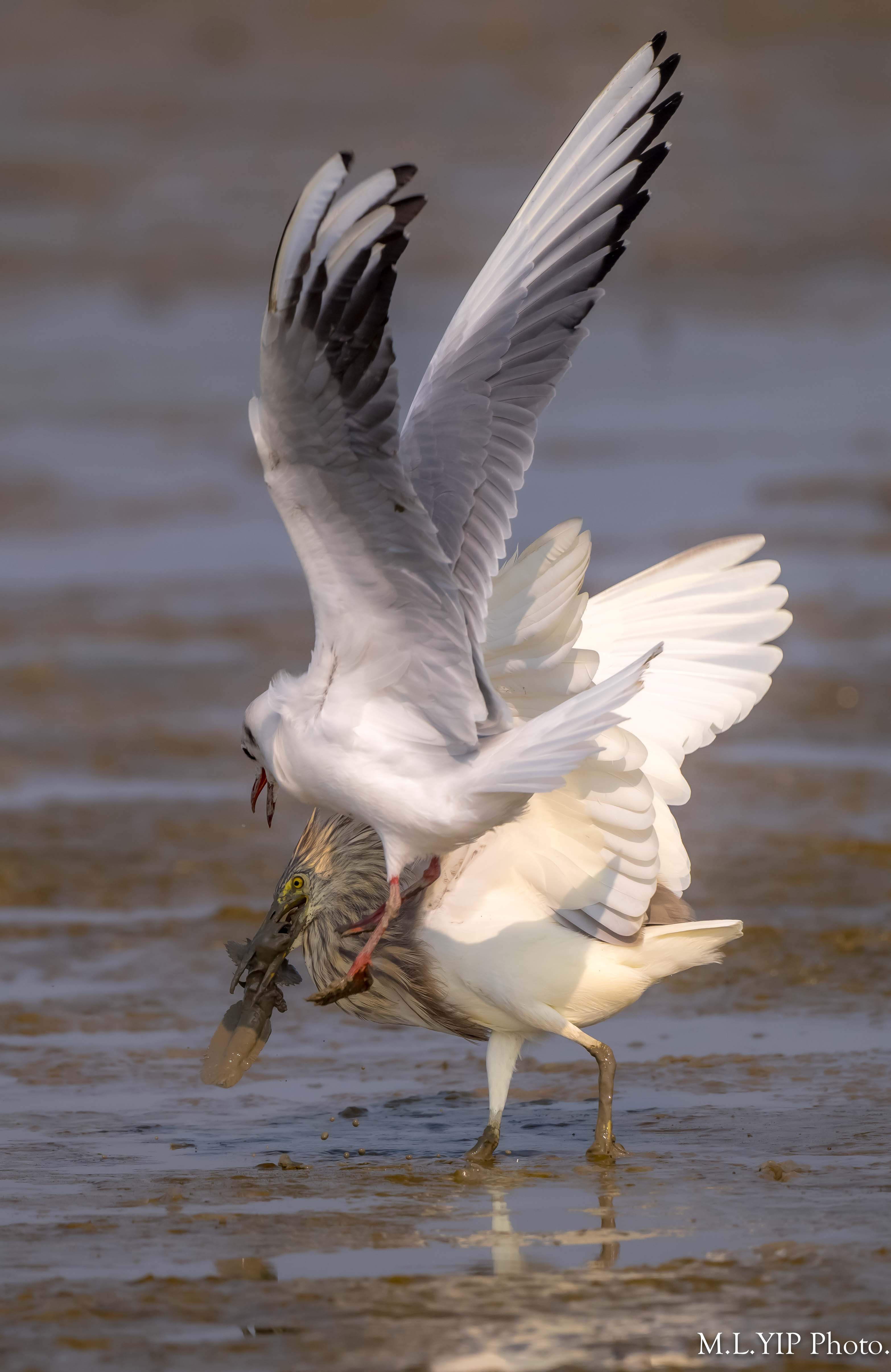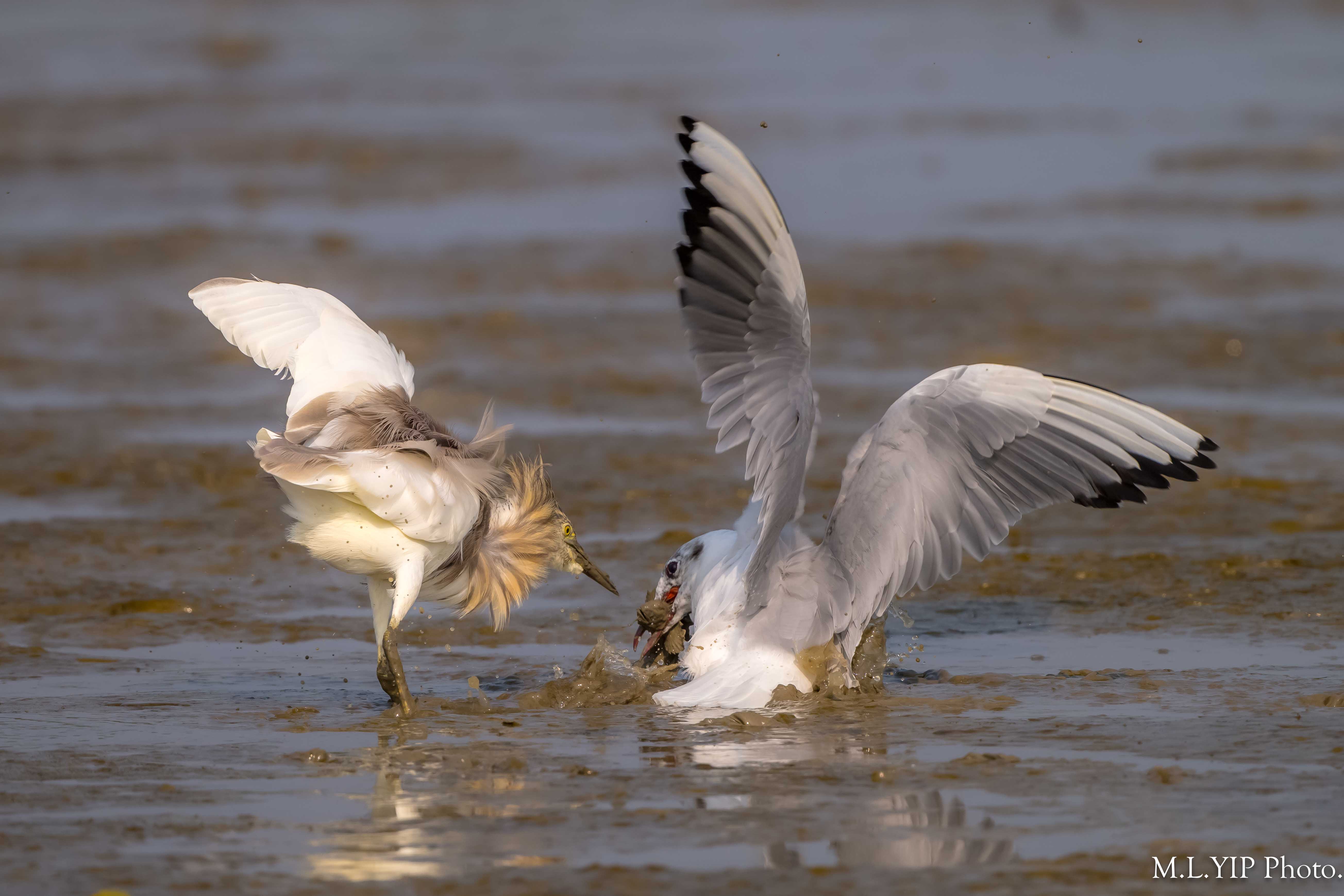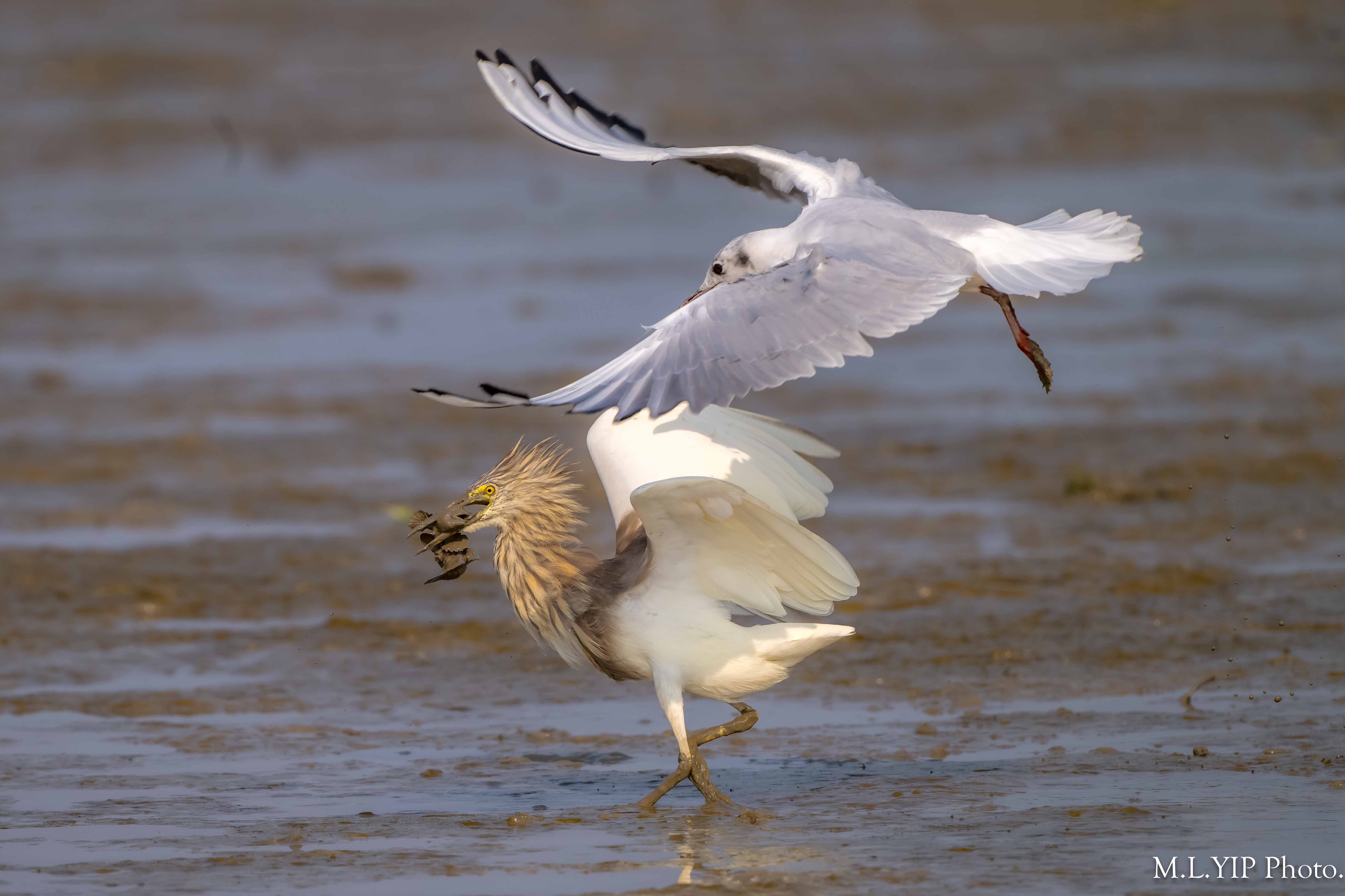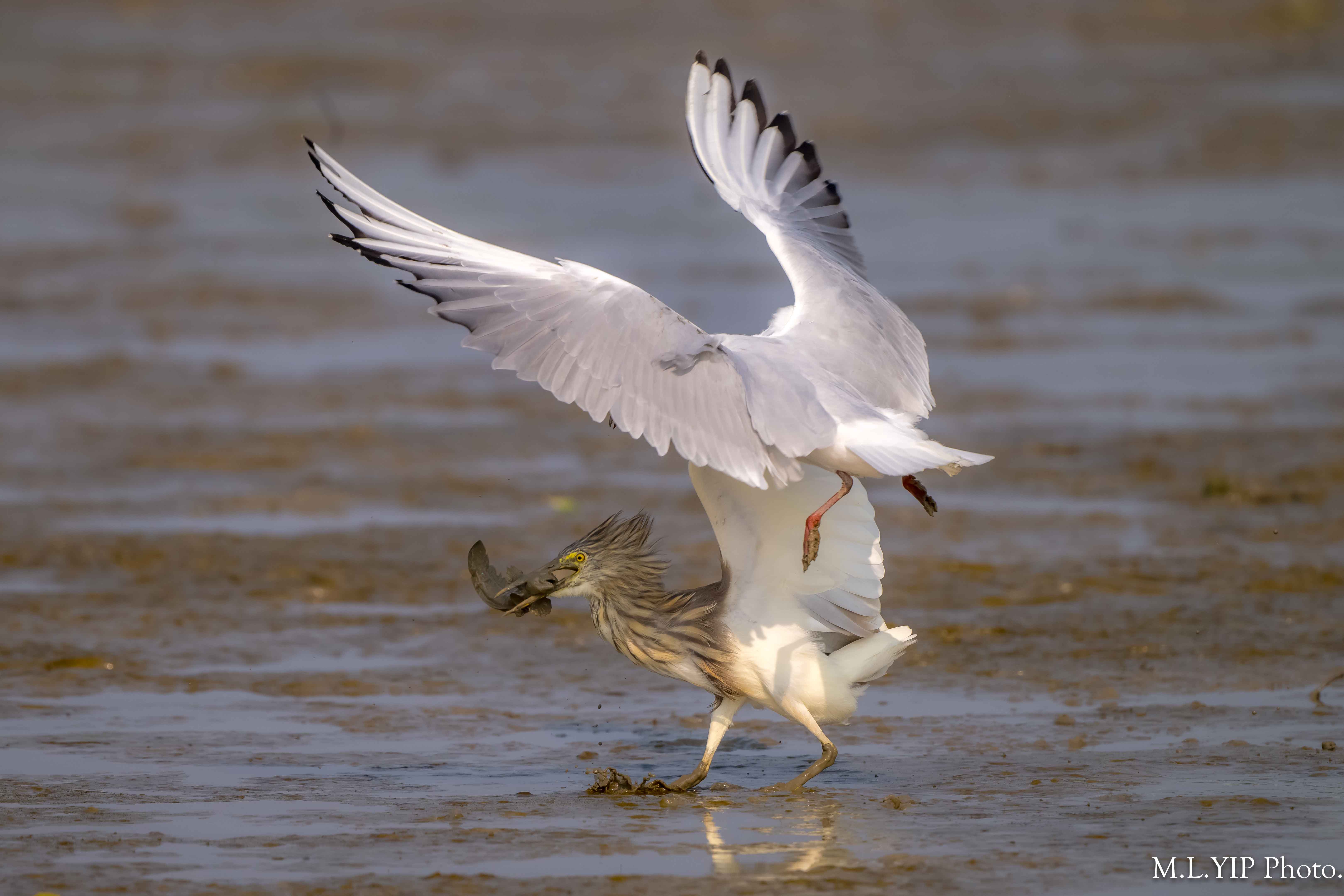 池鷺捉到魚,紅嘴鷗馬上靠近.