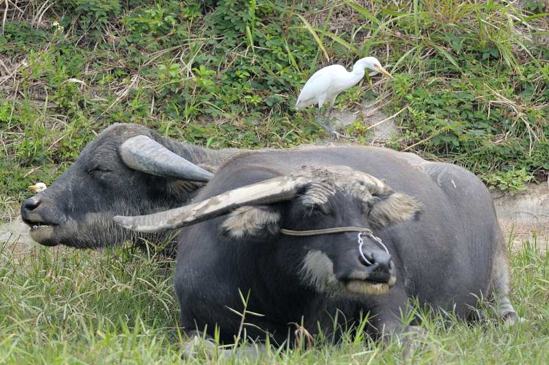 牛背鷺(~51cm) -- 黃咀、黑腳趾、頸粗而短