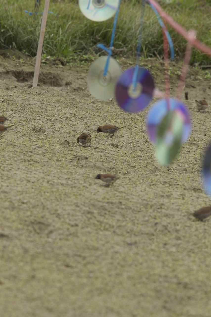 Last Sunday at Long Valley, we saw and took pictures of these - a group of munia eating the newly grown sprouts planted by the farmers even with the CD hanging there and a scarecrow. It seems that the farmers have no better coping mechanism for getting the birds away (I did see one case in Fanling, a Chinese Bulbul was hung over a small farming area in attempt to scare the other birds away; I told the owner of the land to let go the bird; otherwise...). I want to see if there are in this society any experts on this matter, to help the farmers to cope with that and to help them to live happily with the birds. I bet AFCD has done something like that before and it does not seem working.