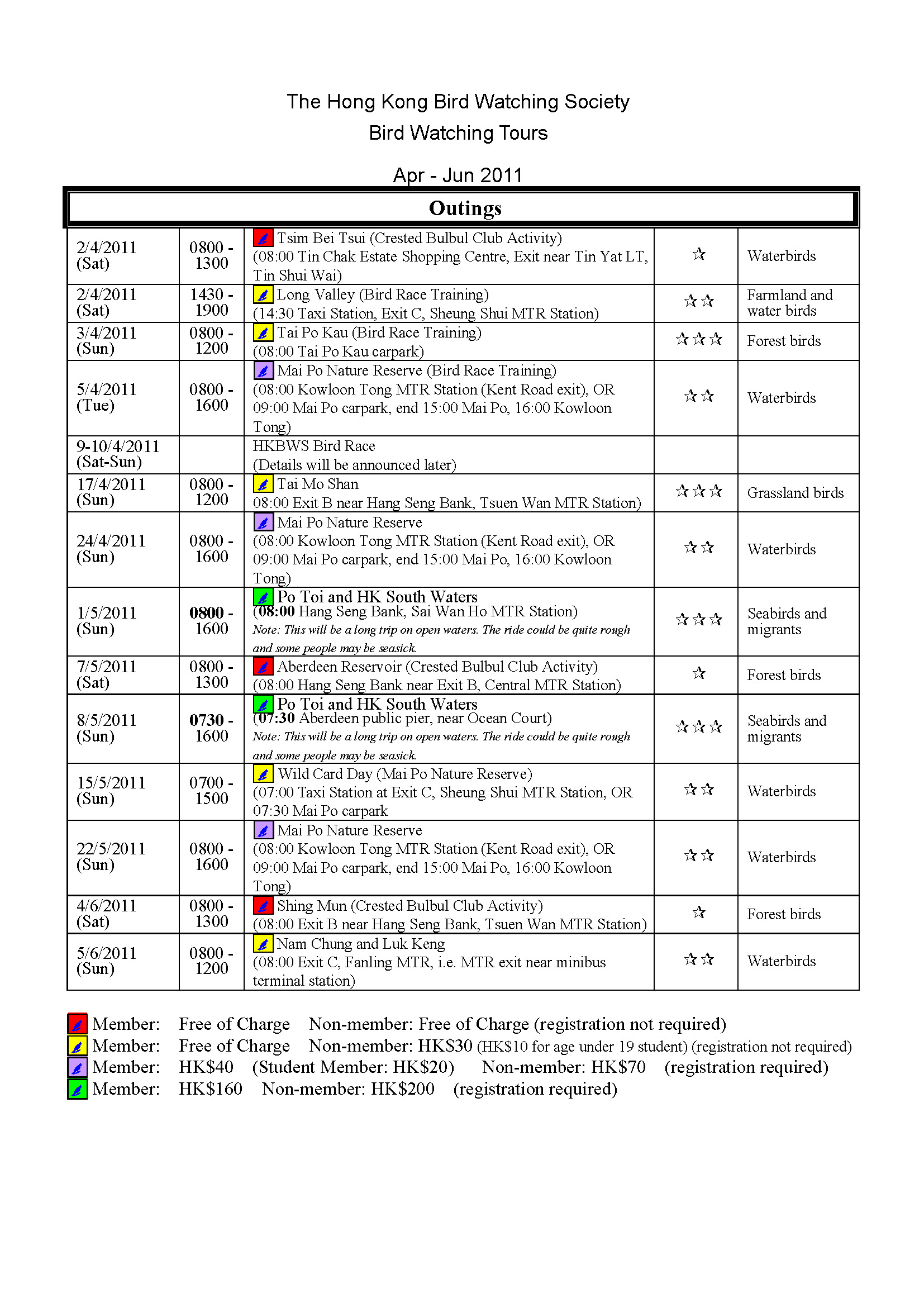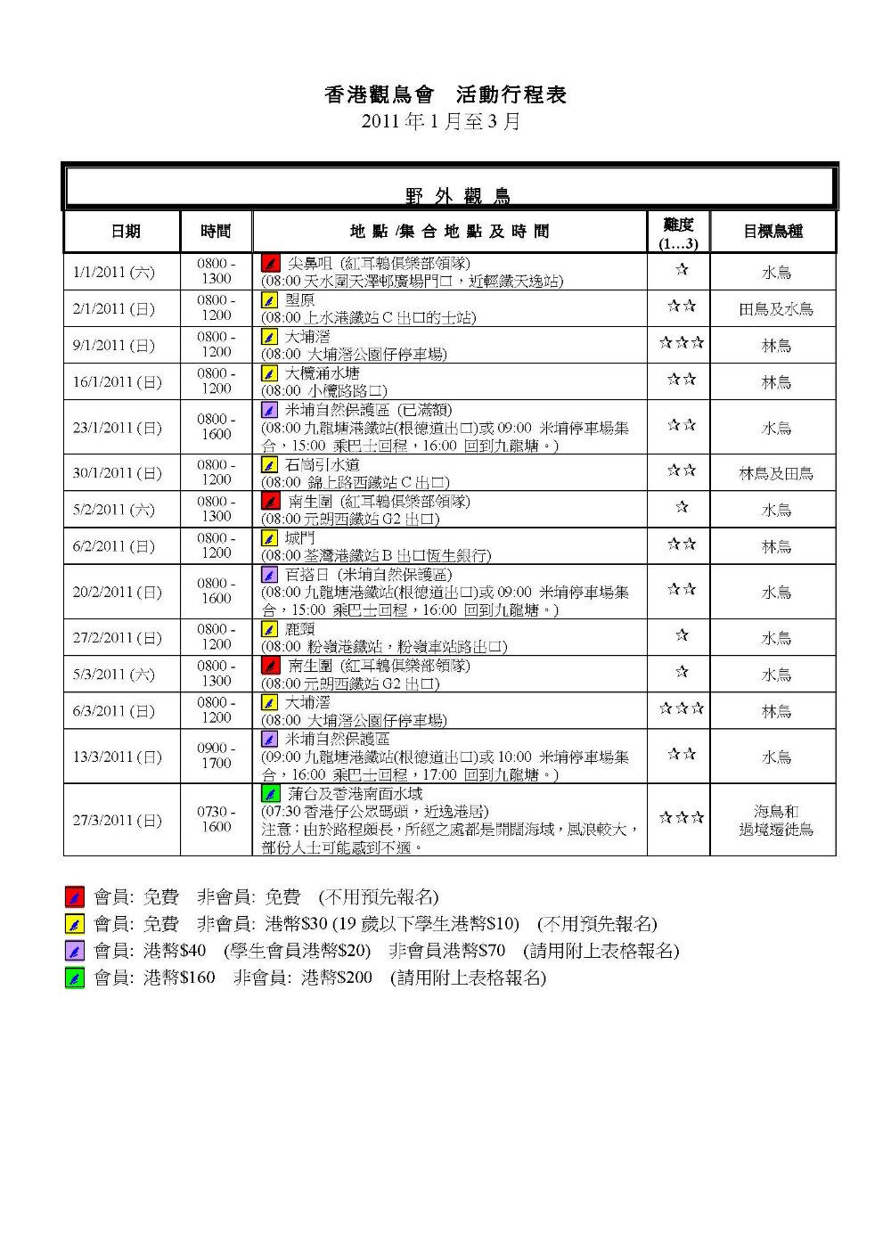 2011年1-6月戶外觀鳥活動時間表 Jan-Jun 2011 Outing Timetable
