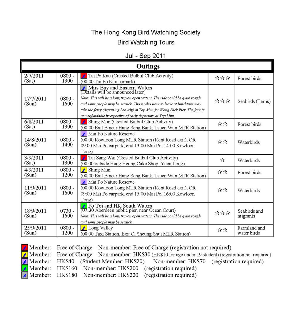 2011年7-9月戶外觀鳥活動時間表 HKBWS Jul-Sep 2011 Outing Timetable
