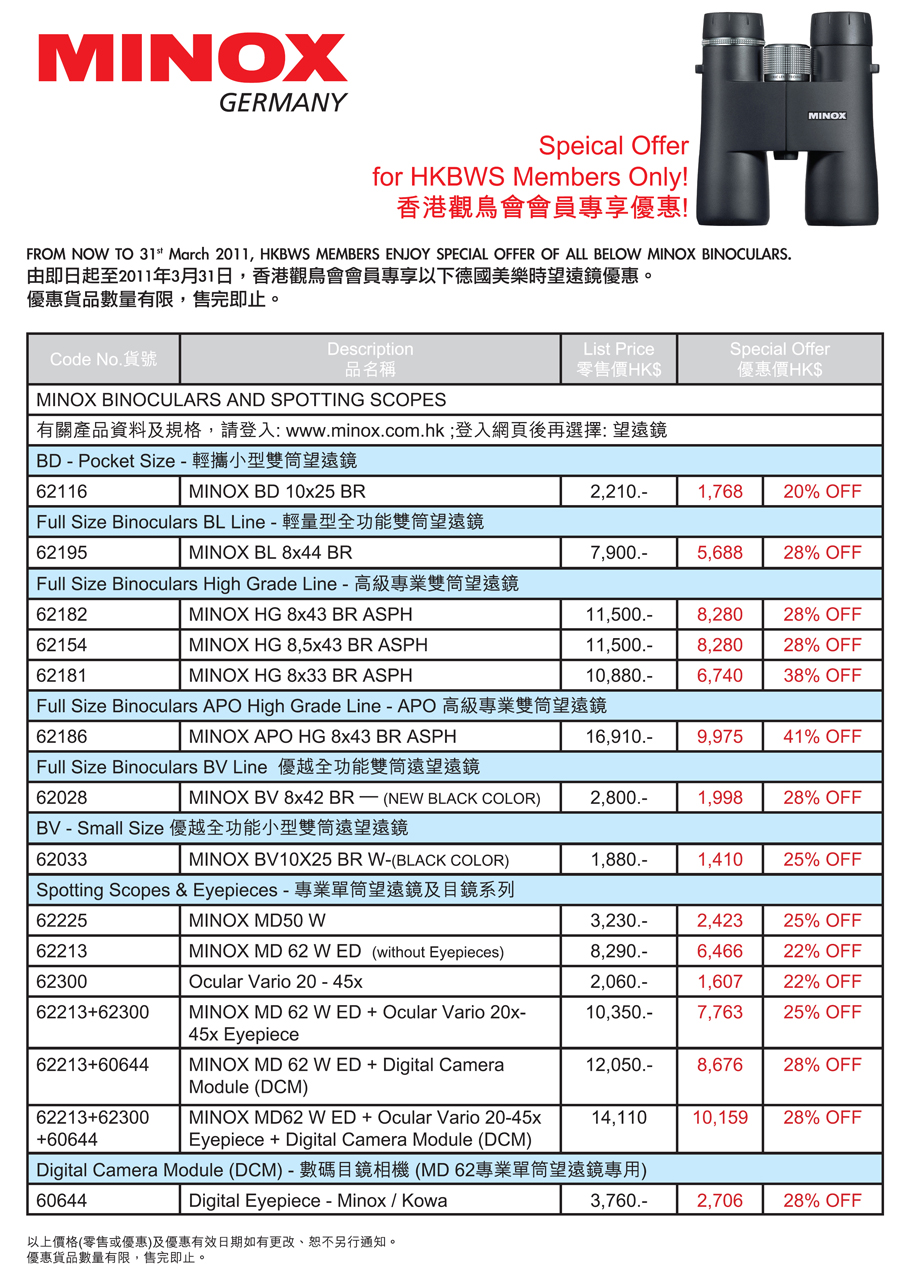 美樂時望遠鏡優惠 Special Offer of Minox Binoculars (至Till 31/3/2011)