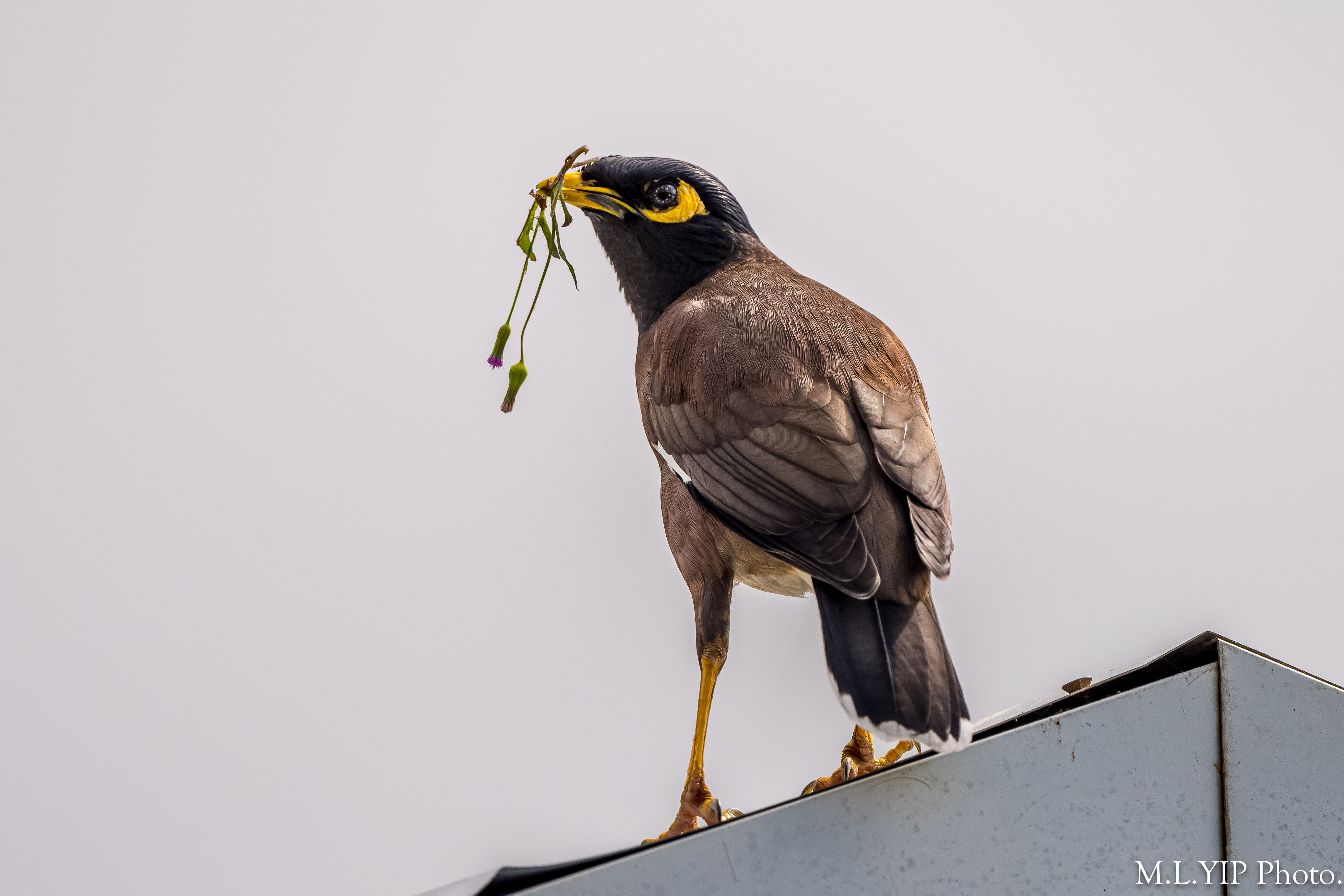 這隻家八哥,咀含小花不知想幹甚麼?