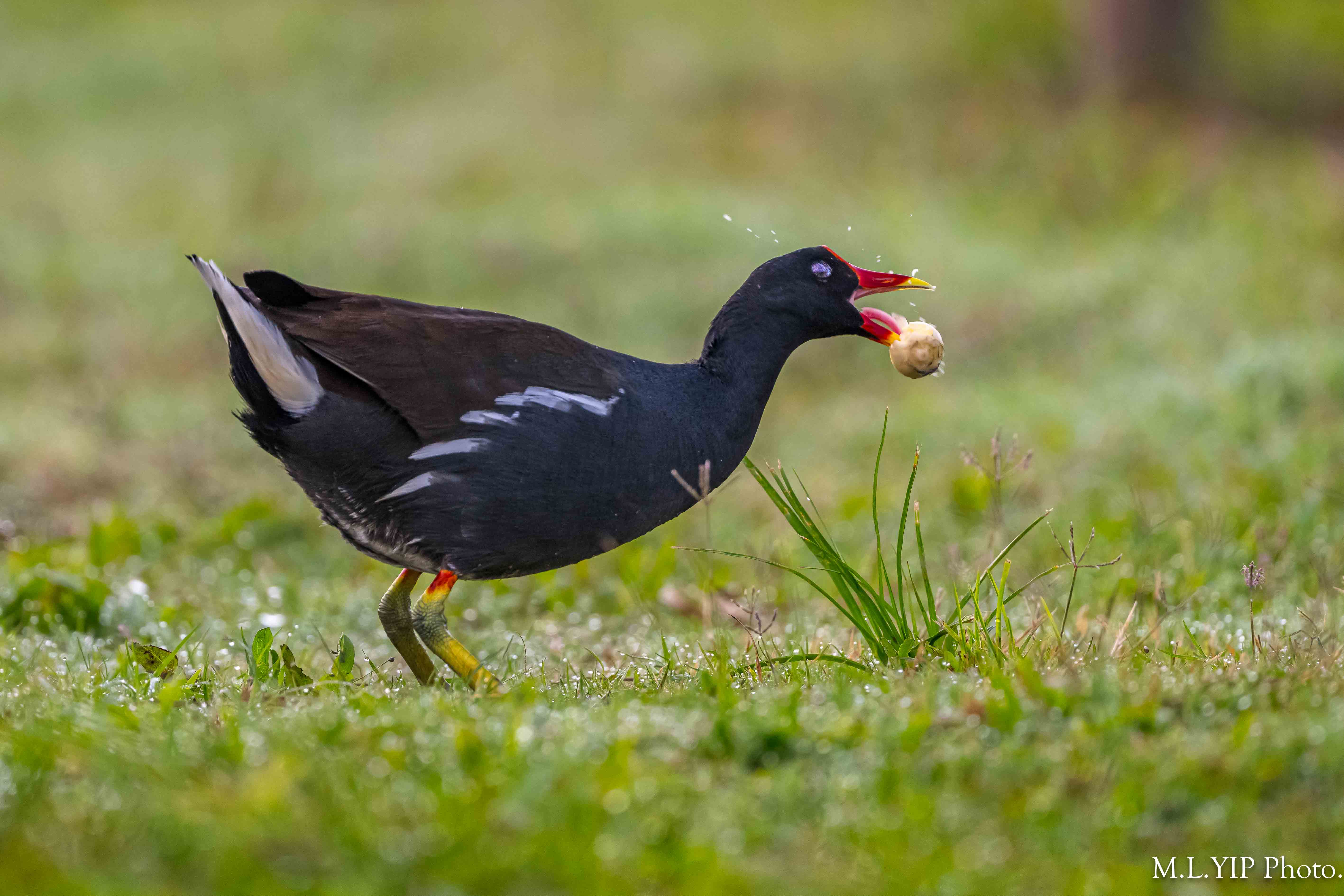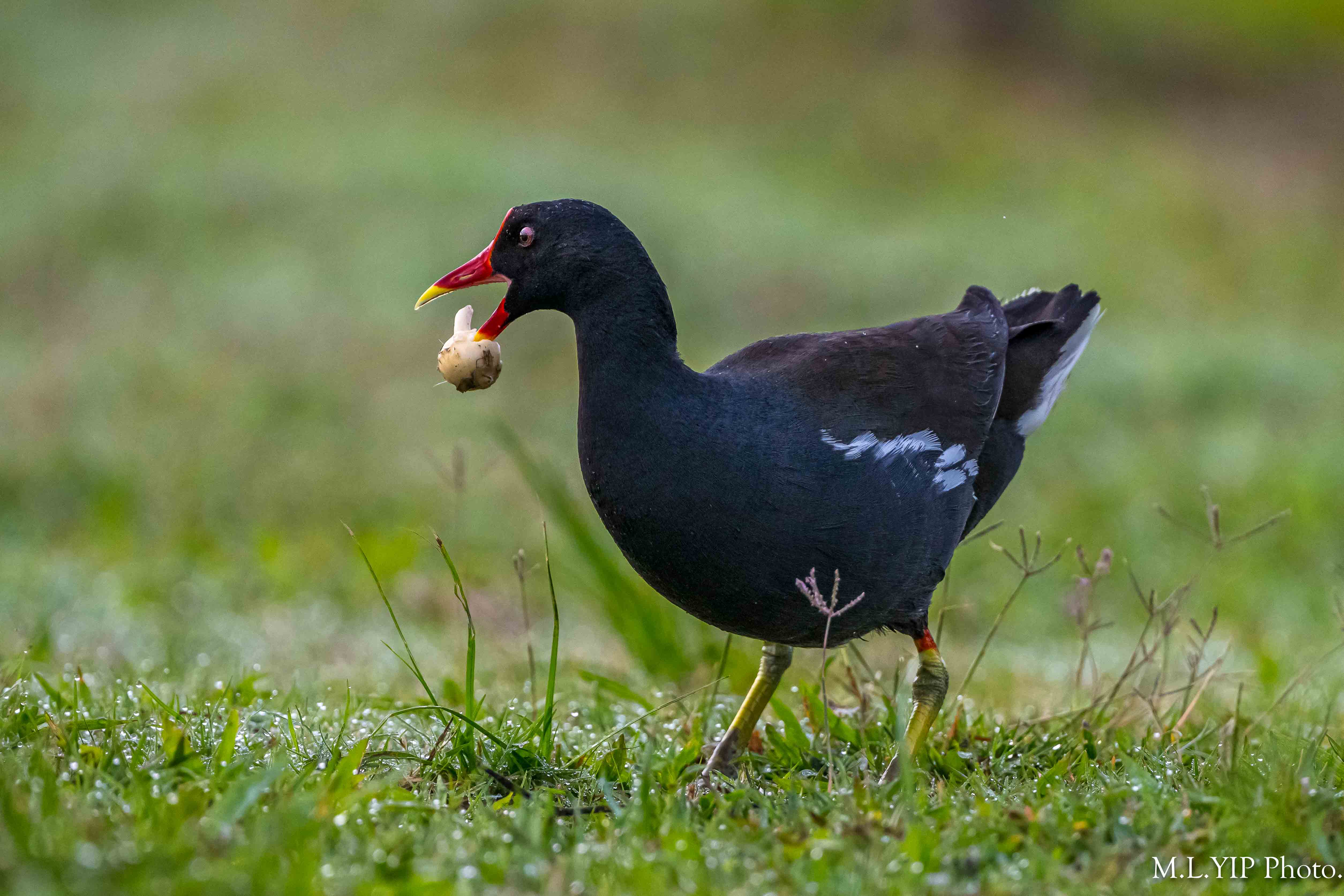 黑水鷄撿到田螺,馬上將它砸破,然後帶回去餵幼鳥.