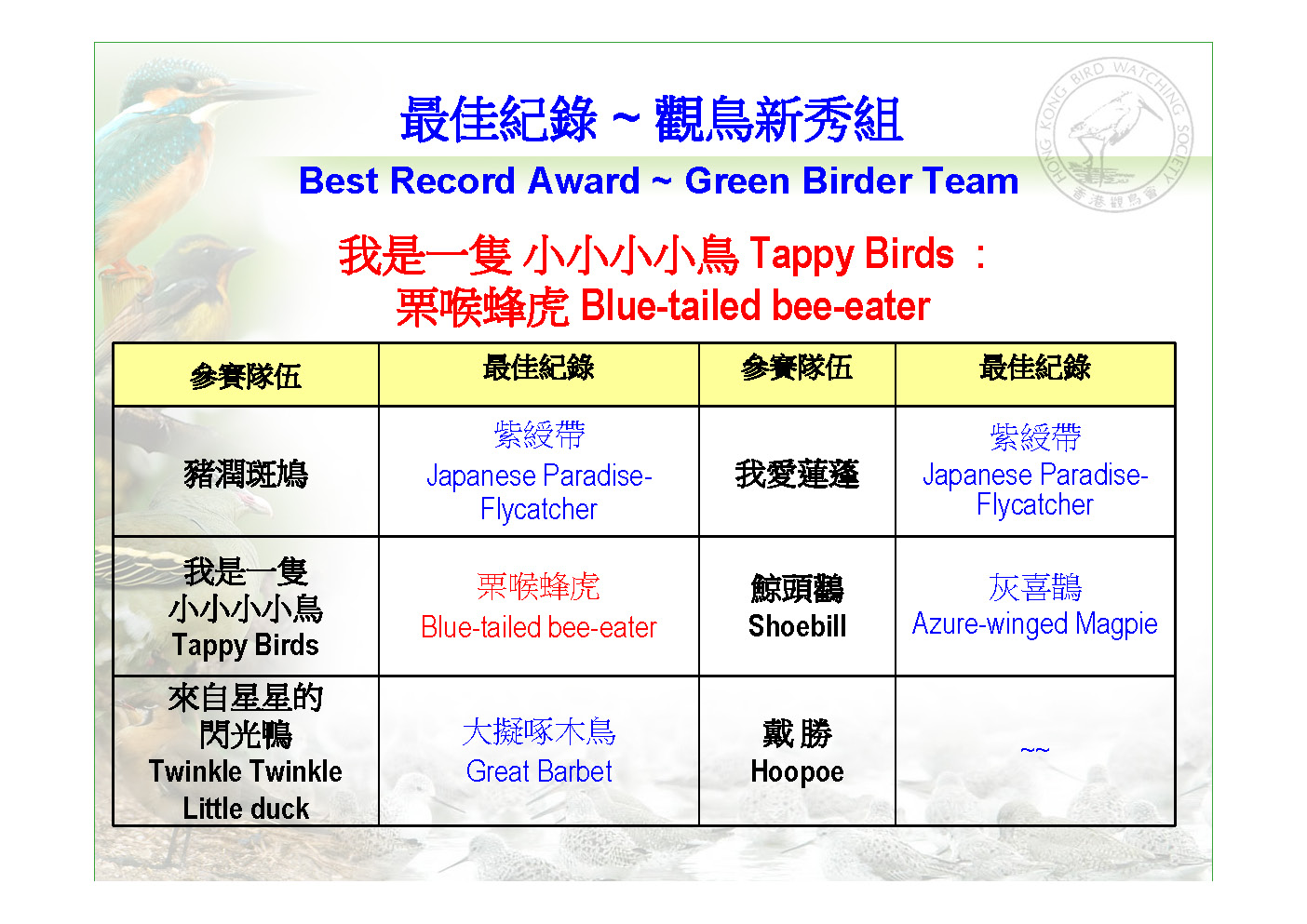 香 港 觀 鳥 日 暨 觀鳥比賽籌款活動 Hong Kong Bird Watching Day Cum Bird Race Fundraising Event