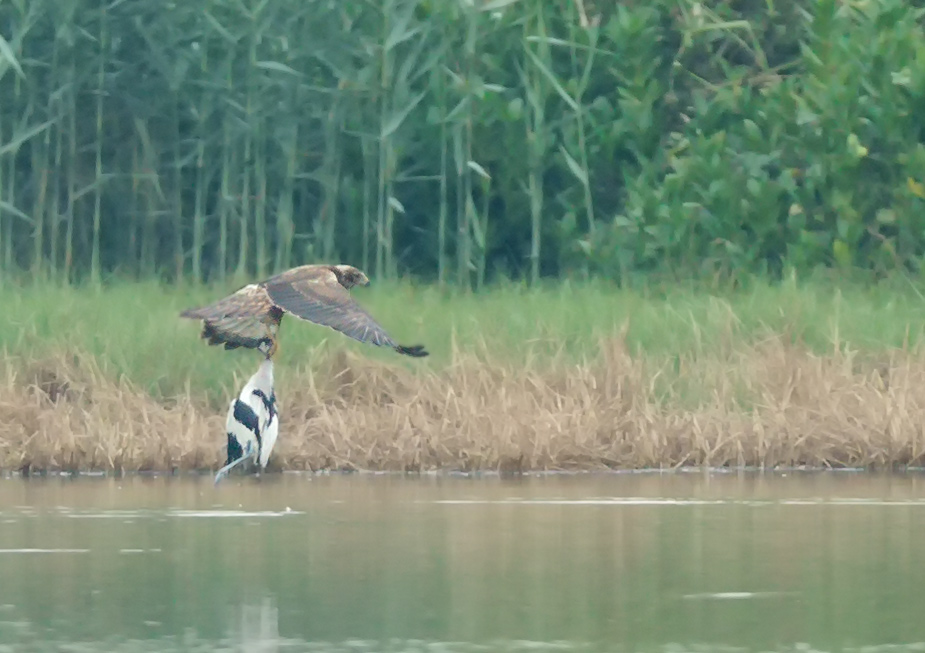 Pied Avocet was killed by a Peregrine Falcon in the water and after making a kill Peregrine Falcon landed near by to take a rest and from somewhere Eastern Marsh Harrier came from top and then ....