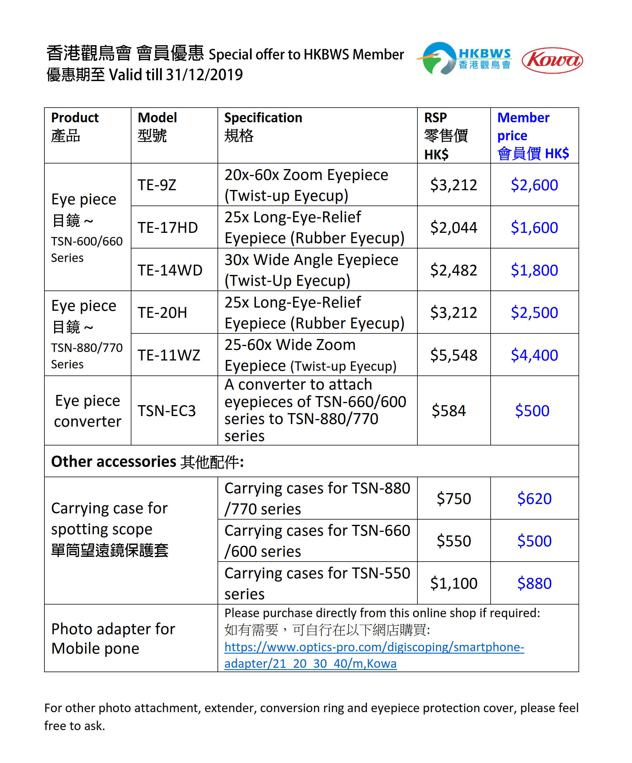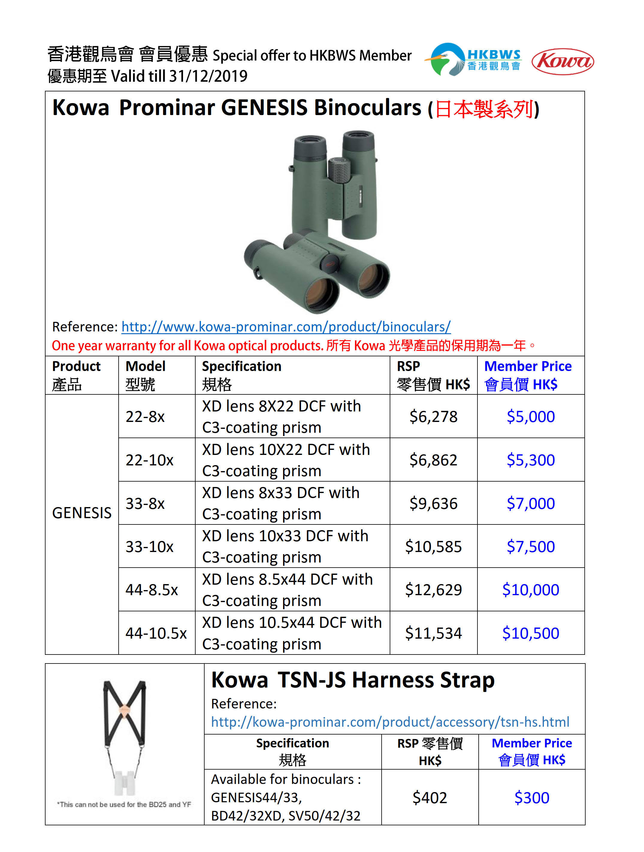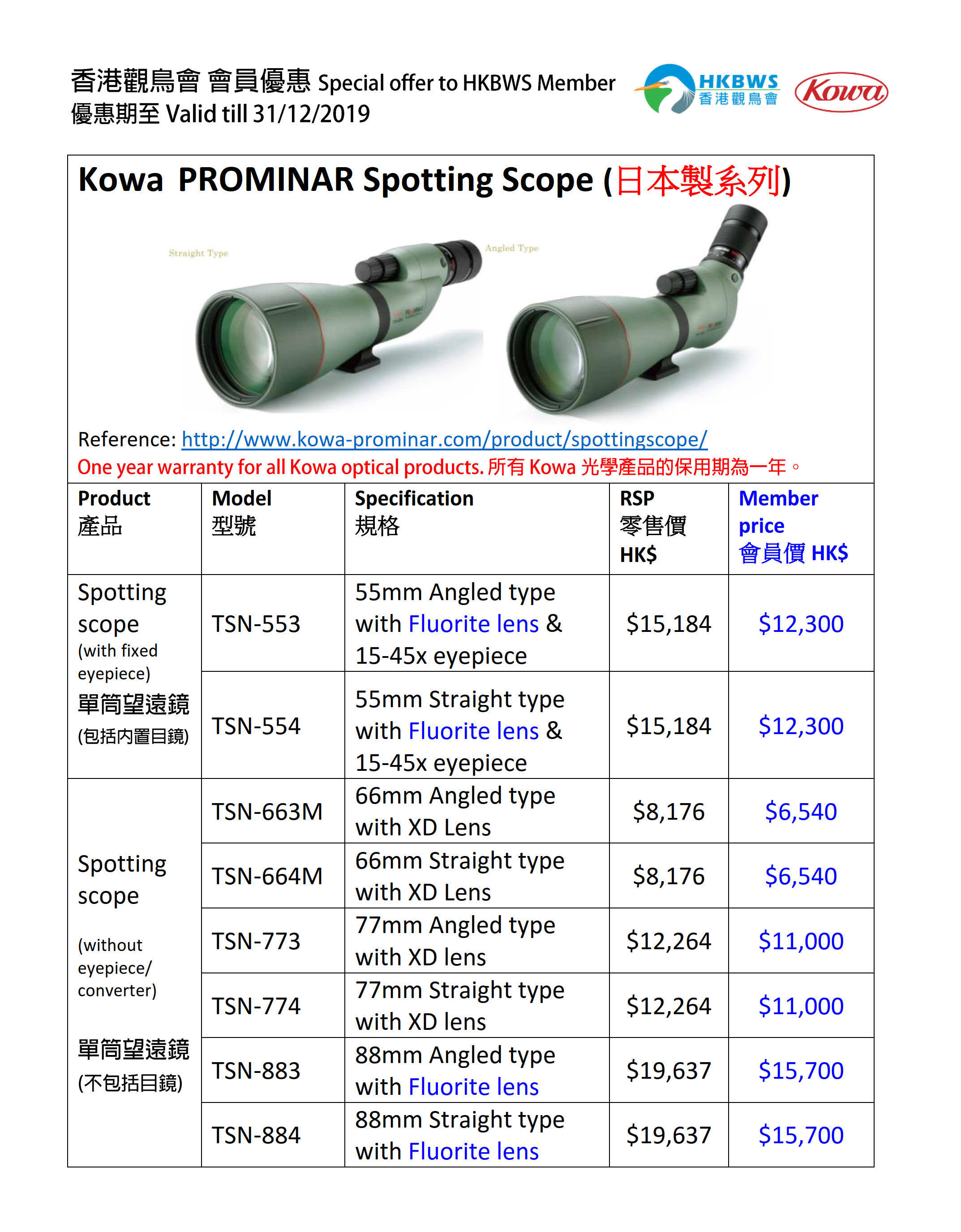 KOWA 望遠鏡優惠 Special Offer of KOWA Binoculars 2019/08-12