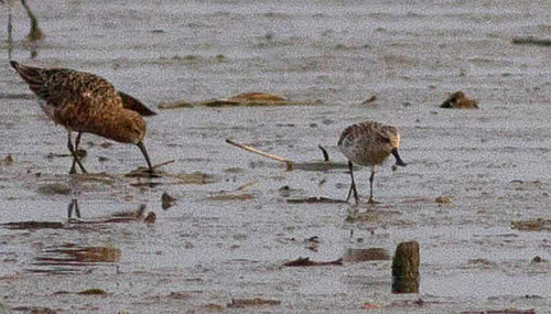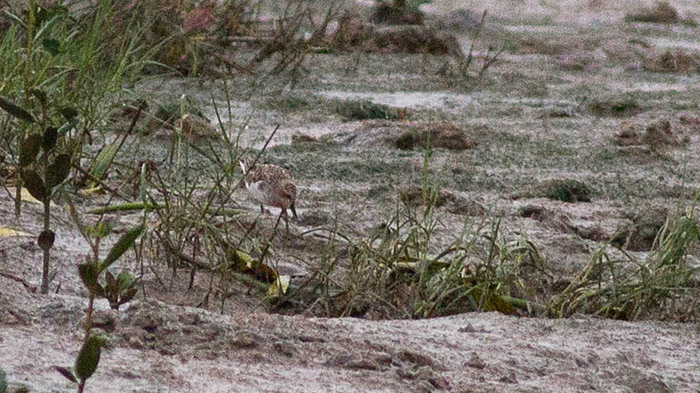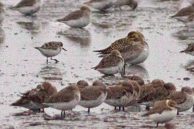 On Friday 20 April the Spoon-billed Sandpiper spent an hour on the falling tide on the green south of the outer hide. It was raining fairly hard and was quite dark, but I am attaching this pic as a document of the record. It was the same partly summer-plumaged bird that was seen on the two previous days.