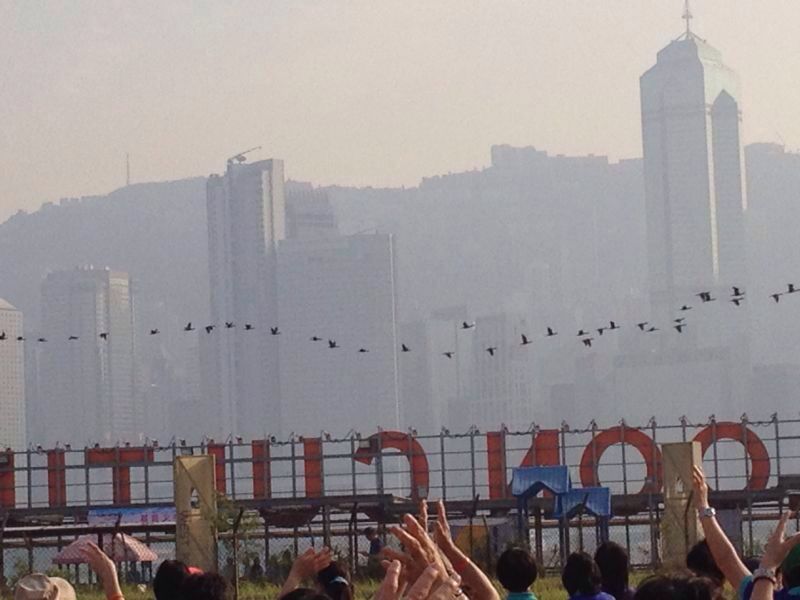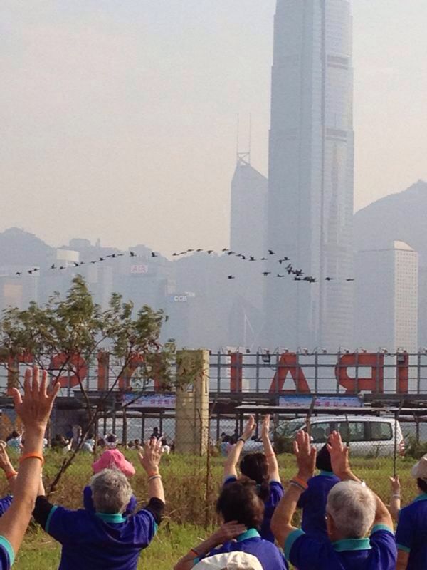 I have attended the "Praise Dance" activity held on 16 Nov 2013.  At the opening ceremony, a group of 40+ birds suddenly flied over our heads like a parade.  Could any one help ID the birds for me?  Sorry that the photos are of the highest resolution that I can get.