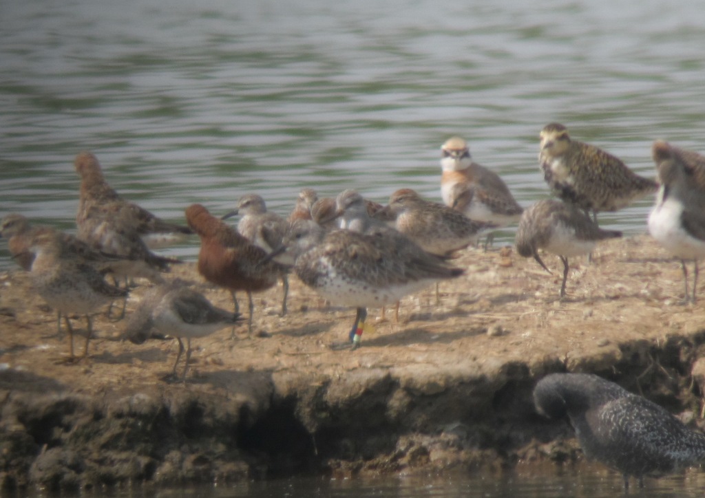 Bird 1. I think the left leg combination is actually Yellow, Red, Green. I realise the green is not very obvious on this bird, but I think that is due to the light. It is also important to note that this is a yellow flag, not a colour ring (also very important to note that this is on the lower leg). This bird is part of an ongoing study in Australia and China looking into refuelling behaviour by Great Knot, Red Knot and Bar-tailed Godwit.
