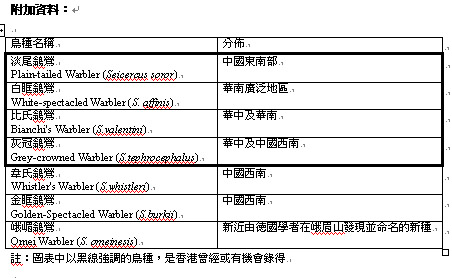 Share with members message that we have sent to journalist: 可 能 是 香 港 首 次 出 現 鳥 種 2004 年10 月 9 日 , 香 港 觀 鳥 會 會 員 黃 理 沛 和 江 敏 兒 在 大 埔 滘 拍 攝 得 金 黃 色 眼 眶 的 鶲 鶯 。 經 細 心 觀 察 , 發 現 該 鳥 上 身 明 顯 綠 色 , 鮮 黃 色 腹 部 。 最 特 別 之 處 是 眼 圈 完 整 , 沒 有 翼 斑 , 頭 頂 灰 色 冠 紋 上 有 淡 紋 , 冠 紋 向 眼 部 伸 延 , 加 上 尾 側 只 有 少 量 白 邊 等 特 徵 。 由 於 該 鳥 與 以 往 所 拍 攝 的 白 眶 鶲 鶯 不 同 ( 白 眶 鶲 鶯 是 寬 闊 的 黃 色 眼 圈 在 眼 上 斷 開 )。 他 們 於 是 向 觀 鳥 會 其 中 一 位 紀 錄 委 員 查 詢 , 才 得 知 該 鳥 可 能 是 香 港 首 次 錄 得 鳥 種 。 目 前 , 有 關 資 料 已 呈 交 至 香 港 觀 鳥 會 紀 錄 委 員 會 待 專 家 鑑 定 。 跟 據 該 鳥 的 外 型 特 徵 , 初 步 懷 疑 是 淡 尾 鶲 鶯 (Plain-tailed Warbler) , 以 目 前 的 觀 察 來 看 , 普 遍 認 為 可 能 是 香 港 首 次 出 現 的 鳥 種 。 由 於 現 有 關 於 「 金 眶 鶲 鶯 」 類 別 的 鳥 種 資 料 仍 然 有 限 , 有 關 資 料 仍 需 進 一 步 確 認 。 分 類 學 解 開 「 鳥 種 之 迷 」? 從 前 金 眶 鶲 鶯 被 認 是 一 個 具 有 多 亞 種 的 鳥 類 , 不 過 跟 據 權 威 鳥 類 學 雜 誌 Ibis ( 第 141 期 , 第 一 冊 , 1999年 "The Golden-spectacled Warbler: a complex of sibling species, including a previously undescribed species" ) , 以 羽 毛 特 徵 、 生 態 行 為 特 徵 , 形 態 學 差 異 , 鳴 叫 特 點 和 分 子 生 物 學 ( 例 如 DNA ) 的 證 據 將 金 眶 鶲 鶯 分 為 多 個 鳥 種 。 新 發 現 鳥 種 背 頭 的 故 事 雖 然 這 個 紀 錄 尚 待 證 實 , 不 過 這 帶 出 了 專 家 如 何 處 理 鳥 類 紀 錄 。 新 鳥 類 紀 錄 在 香 港 出 現 , 有 時 是 因 為 雀 鳥 迷 途 , 流 落 到 遠 離 原 來 分 佈 範 圍 以 外 的 地 方 ; 有 時 是 由 於 香 港 生 境 改 善 , 讓 雀 鳥 的 分 佈 範 圍 得 以 擴 展 ; 也 有 時 是 來 自 辨 認 方 法 或 分 類 學 上 的 進 步 , 將 一 個 鳥 種 細 分 為 多 個 不 同 但 外 形 相 似 的 鳥 種 。 嚴 謹 的 鳥 類 監 察 在 監 察 鳥 類 方 面 , 香 港 是 東 南 亞 境 內 最 優 秀 的 地 方 。 香 港 的 觀 鳥 人 士 有 良 好 的 網 絡 , 分 享 有 關 雀 鳥 的 信 息 , 香 港 觀 鳥 會 的 觀 鳥 熱 線 ( 中 文 :2465 6690 ; 英 文 :2667 4537)和 網 上 新 聞 組 (www.hkbws.org.hk) 可 以 隨 時 報 導 最 新 的 鳥 況 , 讓 鳥 友 可 以 先 睹 為 快 。 在 香 港 觀 鳥 界 中 , 最 令 人 興 奮 的 事 莫 過 於 為 本 地 鳥 類 增 添 新 紀 錄 。 不 過 , 在 接 納 每 個 新 紀 錄 之 前 , 香 港 觀 鳥 會 紀 錄 委 員 會 都 會 嚴 謹 的 審 核 , 確 保 沒 有 認 錯 , 同 時 又 要 判 別 發 現 的 是 否 真 的 是 野 生 還 是 逃 逸 的 鳥 類 。 香 港 觀 鳥 會 自 1957 年 成 立 以 來 , 便 開 始 收 集 本 港 的 鳥 類 紀 錄 , 是 唯 一 本 地 鳥 類 紀 錄 的 權 威 。 本 會 曾 編 纂 了 遠 自 1860 年 起 的 鳥 類 紀 錄 , 創 會 47 年 以 來 更 不 斷 有 系 統 地 累 積 整 理 。 紀 錄 委 員 會 由 香 港 5 位 專 家 組 成 , 他 們 不 斷 覆 核 本 會 地 鳥 種 狀 況 , 確 保 出 版 的 鳥 類 資 料 達 到 高 水 準 , 並 且 得 到 國 際 鳥 類 學 家 認 可。 香 港 觀 鳥 會 紀 錄 委 員 會 負 責 收 集 、 整 理 、 評 估 、 覆 核 以 及 出 版 所 有 提 交 至 該 會 的 鳥 類 紀 錄 。 出 版 刊 物 包 括 《 香 港 鳥 類 報 告 》 , 以 及 2001 年 出 版 , 詳 述 本 港 各 種 鳥 類 的 專 著 《 香 港 鳥 類 名 錄 》。