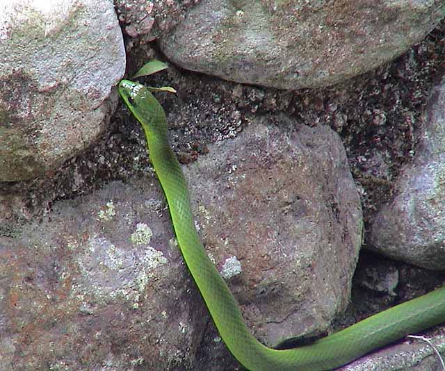here are two pics of the Bamboo snake taken in Wonderland Villas on 8-10-2003. Please note the triangular head, the red eyes and the red tail.