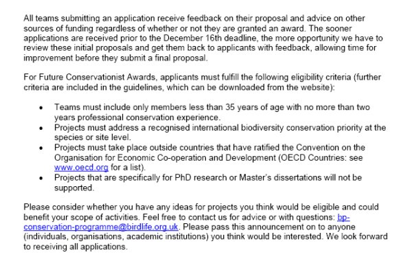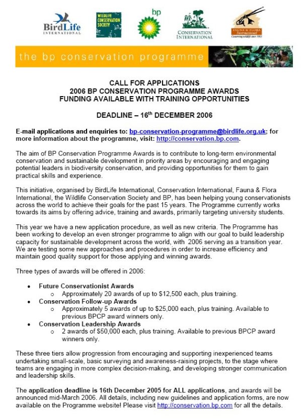 BP Conservation Programme seeks new recruits 04-11-2005 Since 1985, the BP Conservation Programme (BPCP) has supported and encouraged conservation projects that address global conservation priorities at a local level. The Programme aims to contribute to long-term environmental conservation and sustainable development in priority areas by encouraging and engaging potential leaders in biodiversity conservation, and providing opportunities for them to gain practical skills and experience. This is achieved through a comprehensive system of grants, advice and training. The initiative is the result of a unique collaboration between four leading conservation organisations, BirdLife International, Fauna & Flora International (FFI), the Wildlife Conservation Society (WCS), Conservation International (CI), and BP. The Programme is now in its 21st year and, since 1990, has supported a total of 278 projects in 80 countries. Programme Objectives To offer grants, advice and training to teams of young conservationists in areas that are of high global biodiversity importance but where there is low capacity to carry out effective conservation. - To enable all award winning teams to meet their project objectives and disseminate their results effectively. - To provide opportunities for outstanding team members to develop and consolidate their skills through additional project work. - To maintain a network of current and past award winners and provide opportunities to share relevant information, experiences and advice. - To effectively monitor and evaluate emerging leadership in biodiversity conservation developed through Programme support. To apply for the 2006 Future Conservationist Awards project teams must submit a completed application form by 16 December 2005. Click here for more details of how to apply. http://conservation.bp.com/applications/