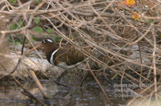 Owlet-nightjar, I'm impressed at your picture of Painted-snipe; they can be really tricky to see on the ground, let alone to photograph! Where in Shek Kong did you take the photo? I do a lot of work with the species and know several locations around Kam Tin/Sha Po, but I would be interested to know where else they occur nearby. Especially because this appears to show a male and female bird. I agree with you that protection of these sites is very important. It's good news that birds have been seen at the wetland park recently, but other sites are fast disappearing - recently yet another good location at Kam Tin has been modified and is probably now unsuitable. It would be a shame if the remaining habitat was also lost.