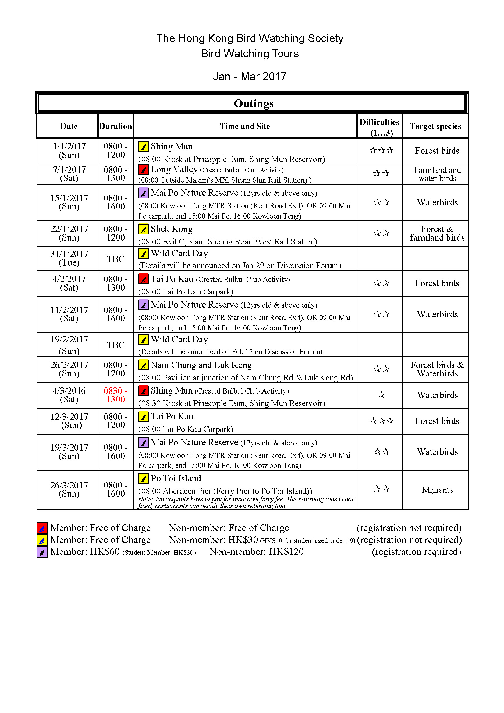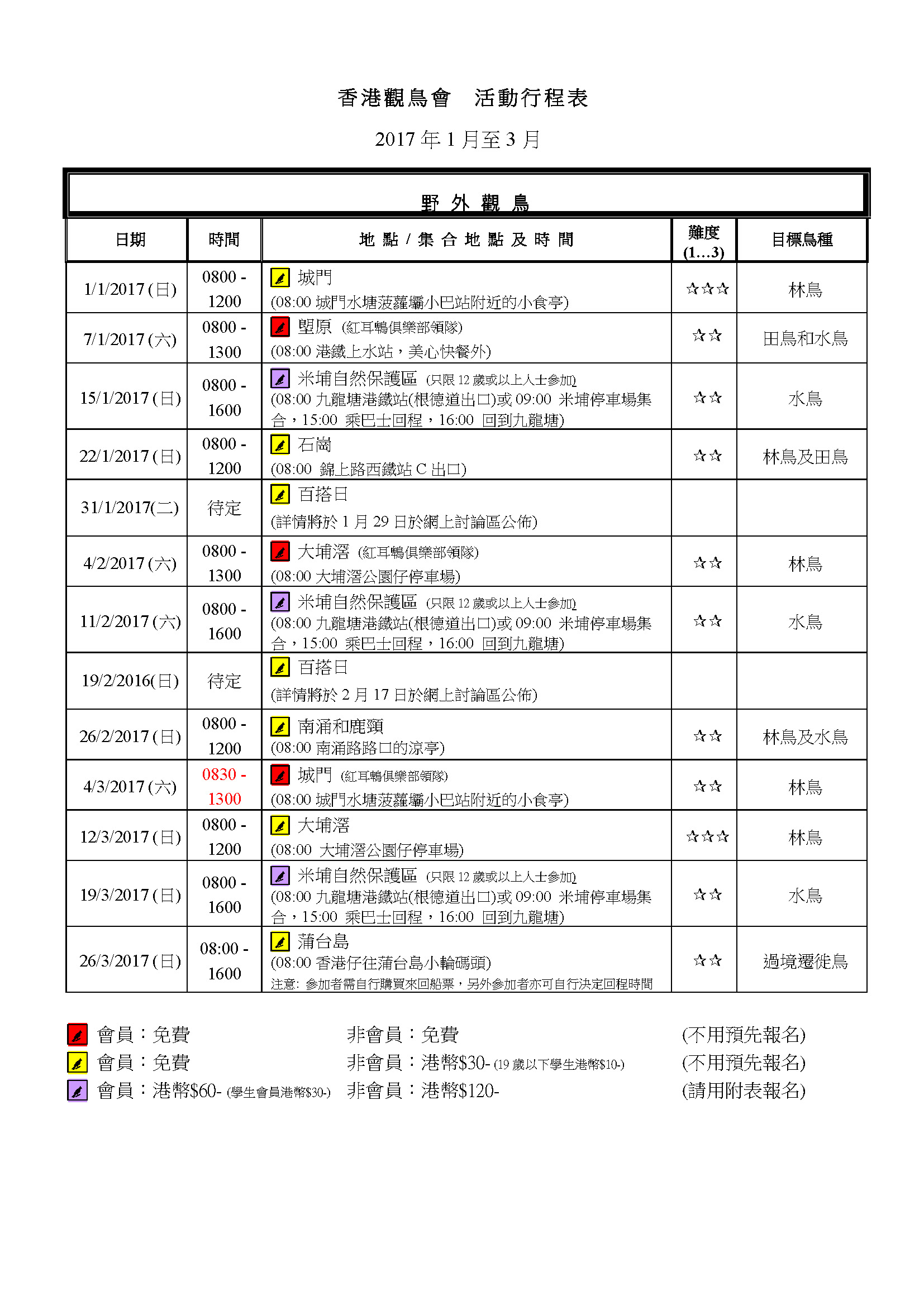 2017年1-3月戶外觀鳥活動時間表Jan-Mar 2017 Outing Timetable
