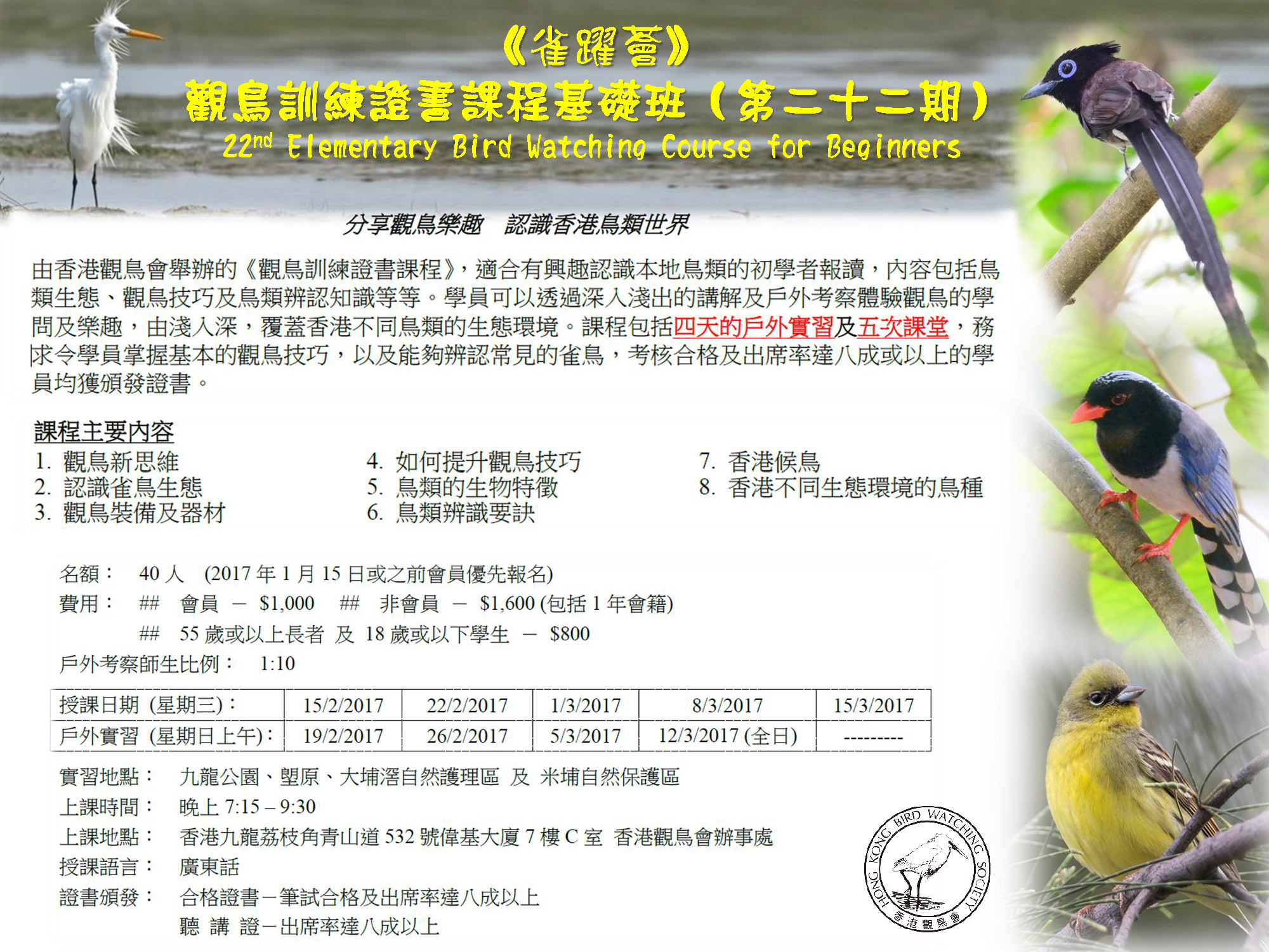 《雀躍薈》觀鳥訓練證書課程基礎班(第二十二期) 22nd Elementary Bird Watching Course for Beginners