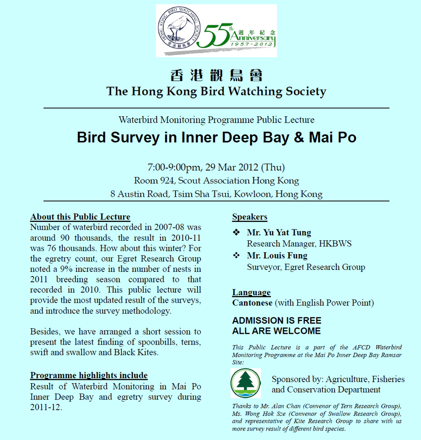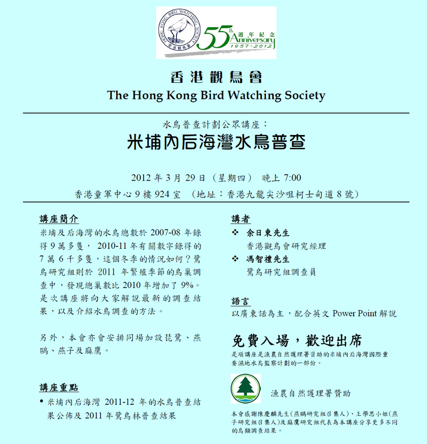 水鳥普查計劃公眾講座 Waterbird Monitoring Programme Public Lecture
