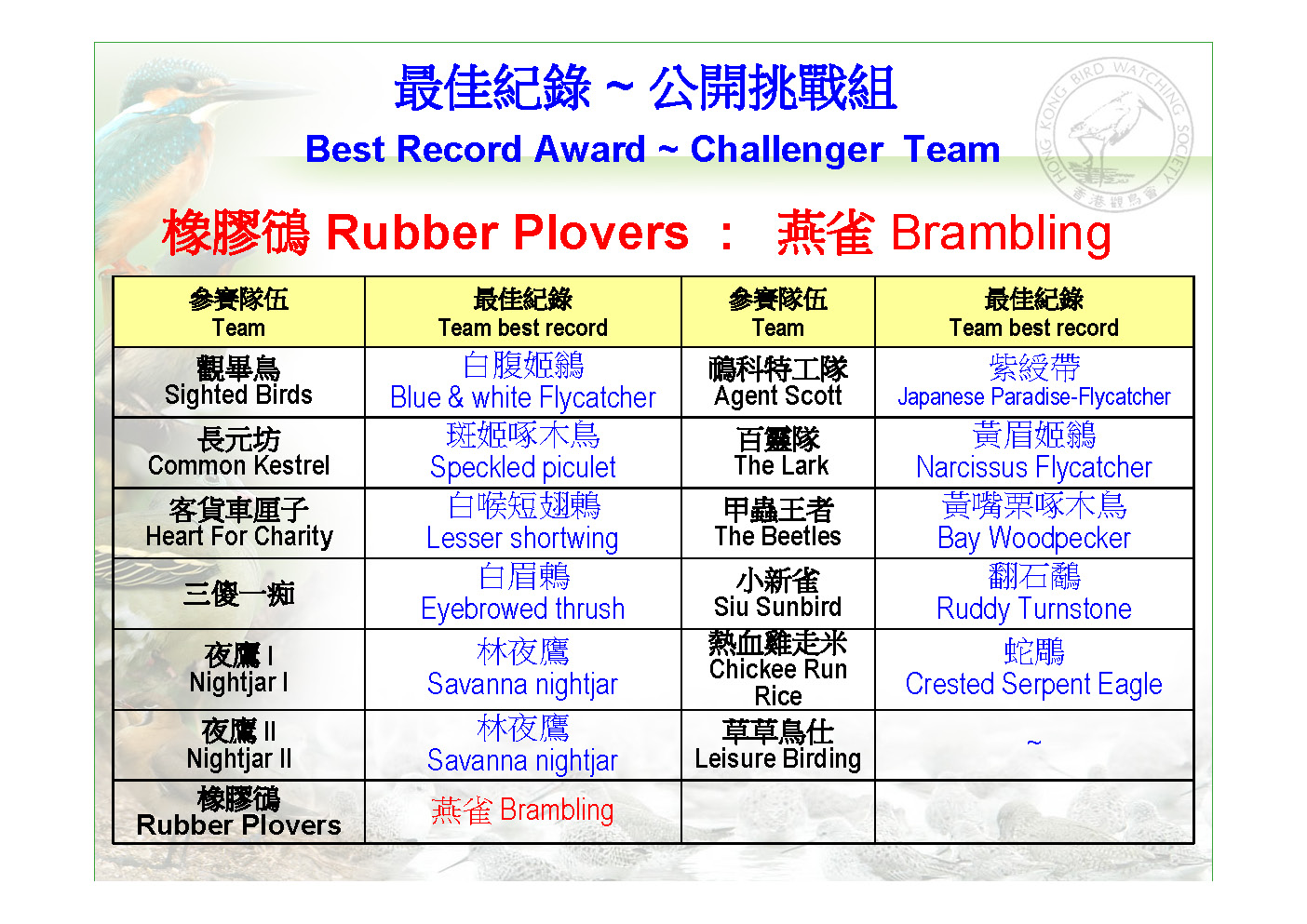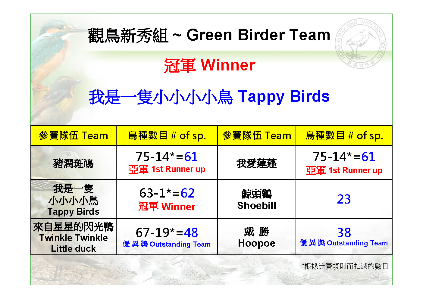 香 港 觀 鳥 日 暨 觀鳥比賽籌款活動 Hong Kong Bird Watching Day Cum Bird Race Fundraising Event
