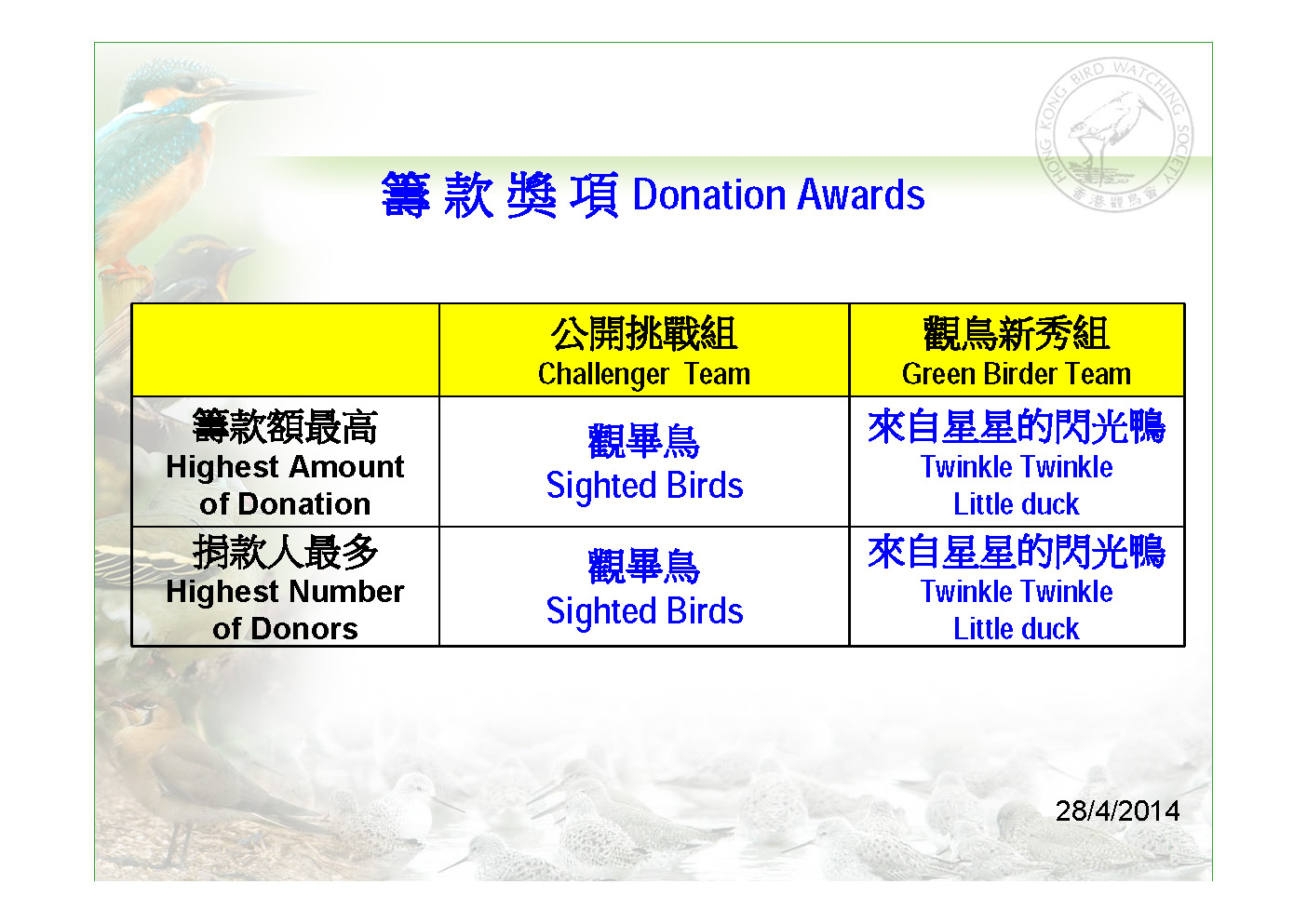 "籌款額最高" 及 "捐款人最多" 獎項: 由於各隊仍有2星期時間籌款,此獎項將於28/4籌款截止後公佈。