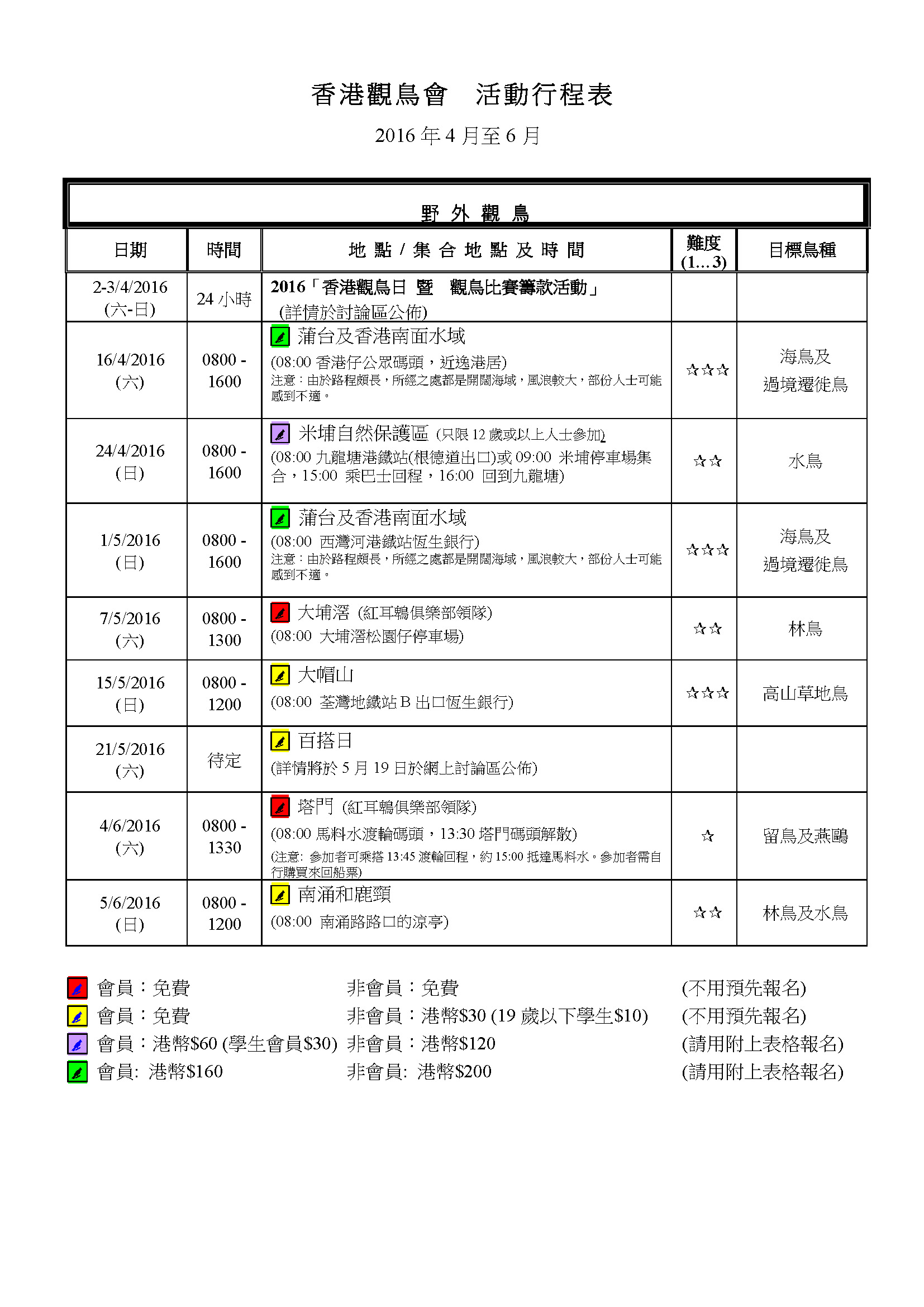 2016年4-6月戶外觀鳥活動時間表 Apr-Jun 2016 Outing Timetable