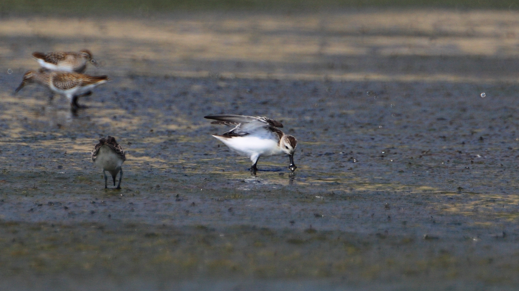 今早我們的調查員於一個參加漁塘管理計劃的漁塘進行鳥類監測工作時, 於一個進行了放水操作的漁塘中發現了一隻極度瀕危的勺嘴鷸。這個乾水的漁塘於潮水高的時間同時吸引了部分其他種類的涉禽,包括了長趾濱鷸和紅頸濱鷸。可見乾了水的漁塘可以為不同種類的水鳥提供合適的生境。