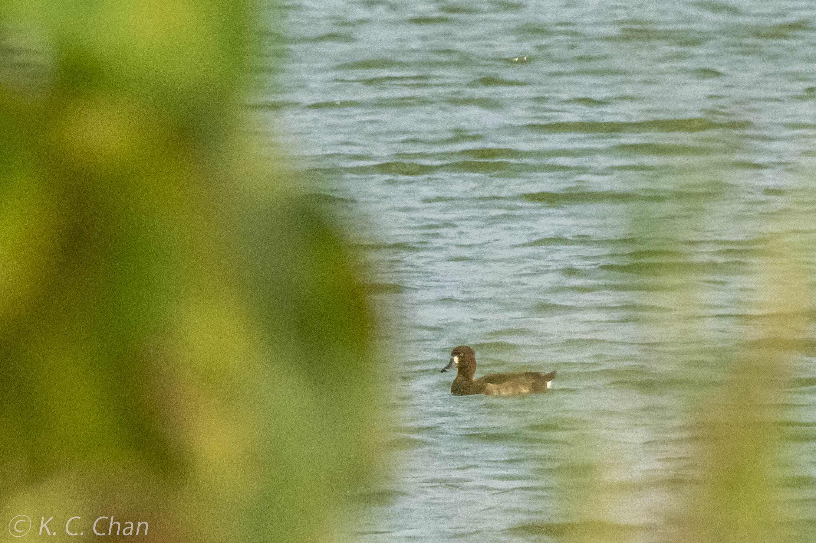 Looks like a great scaup (female).  She has a rounded head without a "tuft," yellow iris, and the white oval patch at bill base.