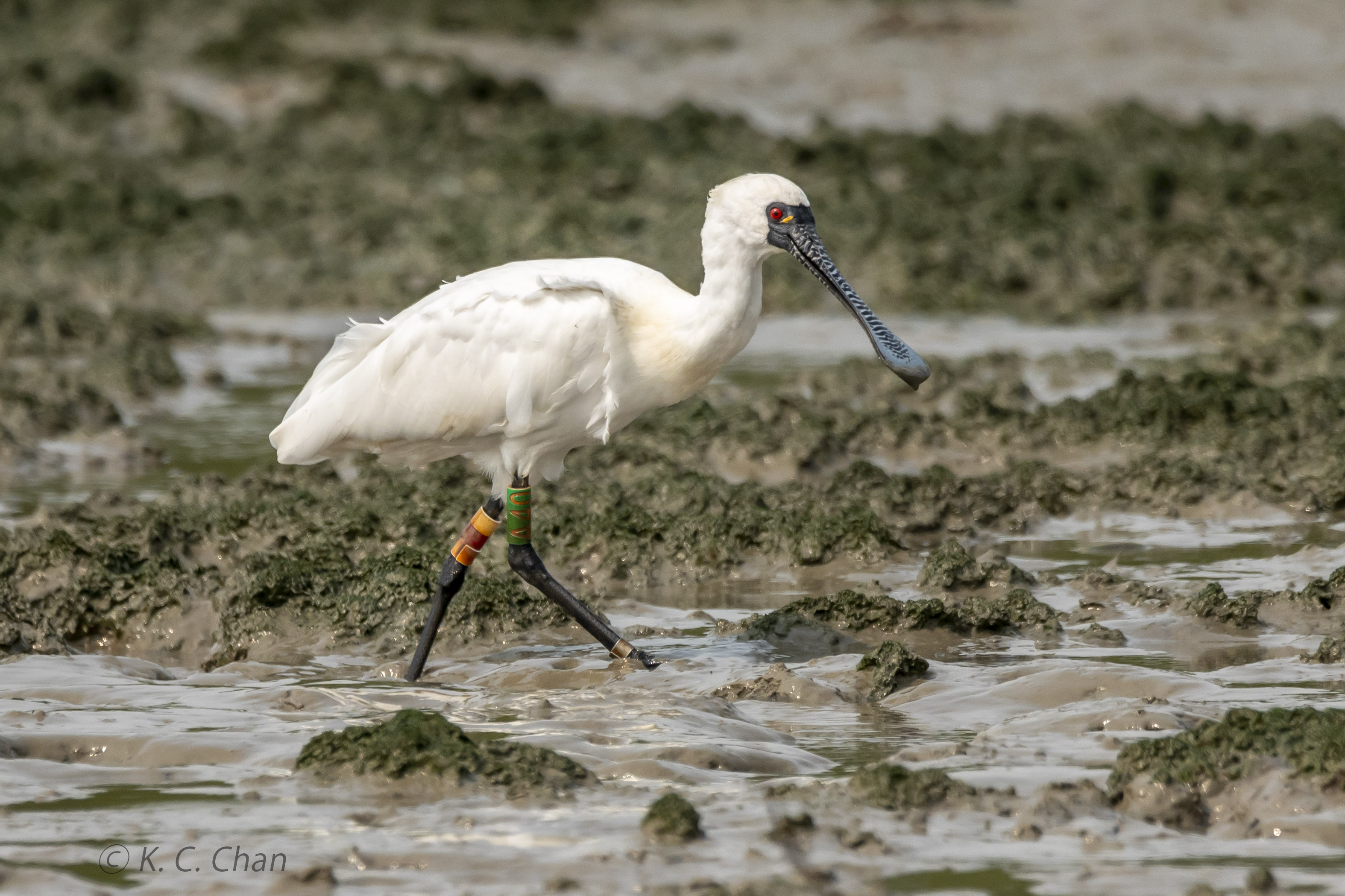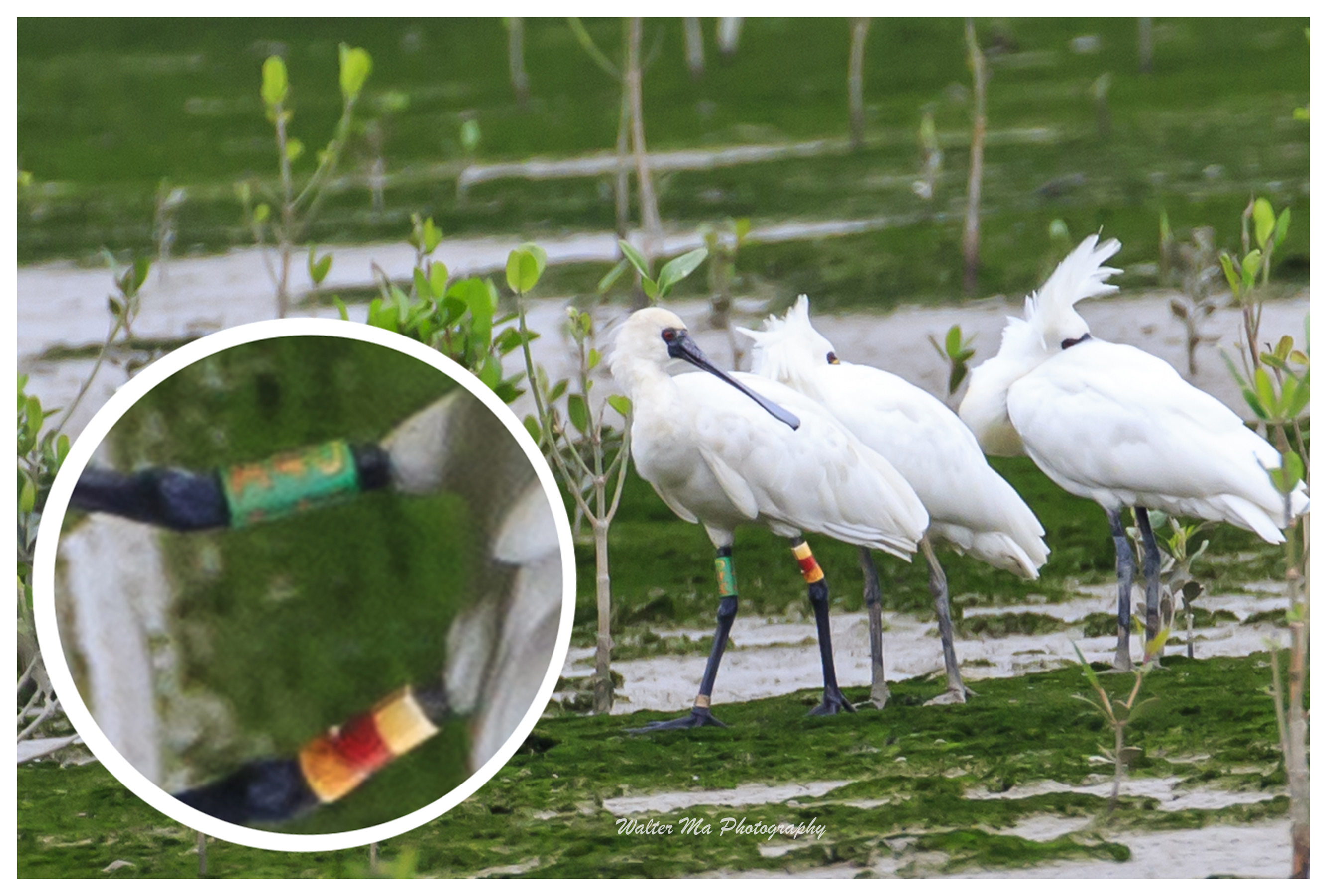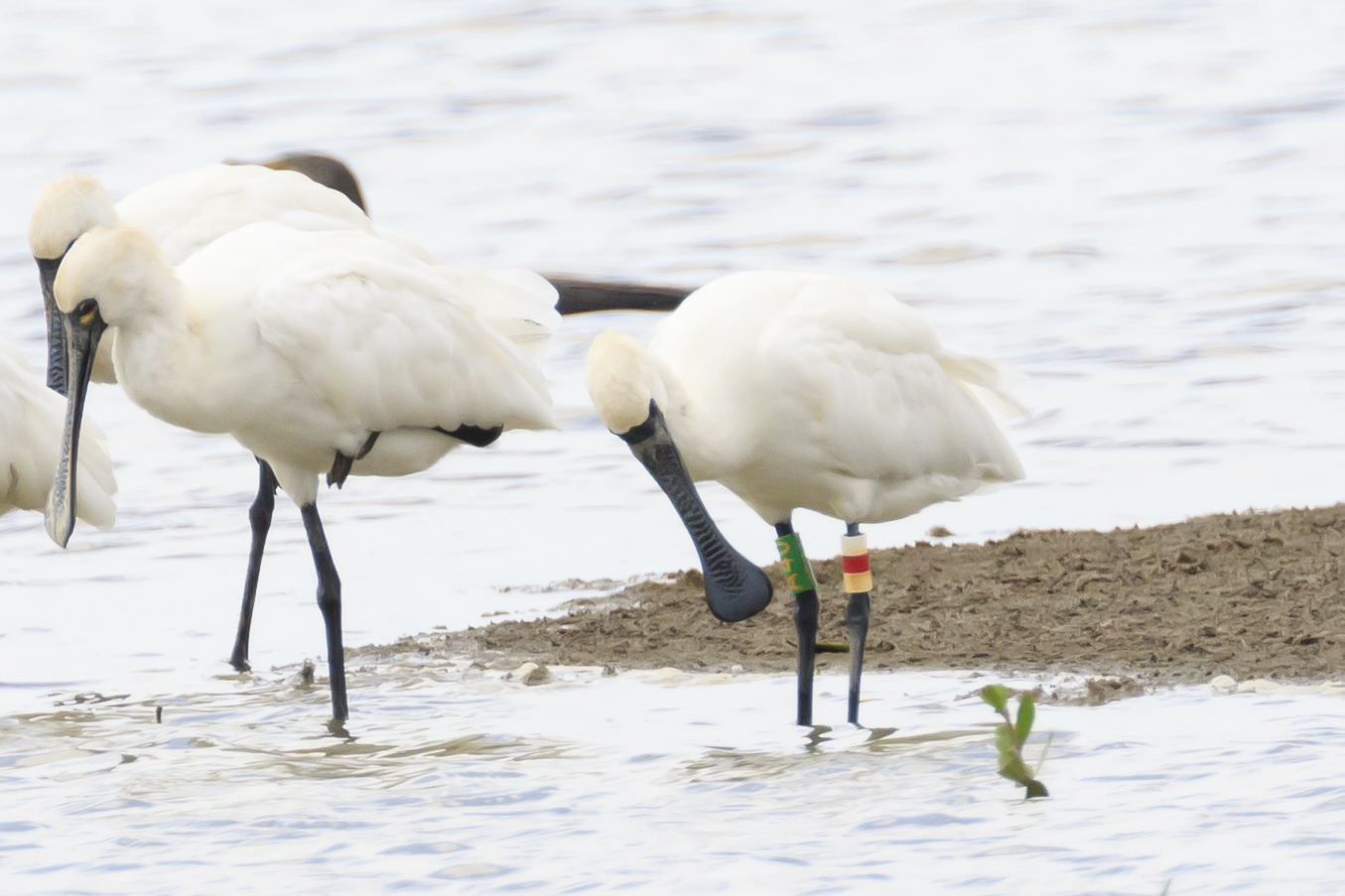 A40的左腳是白/紅/白,不過之前鳥友的相片已看到白色部分不久已漸變黃,看看這隻黑琵是不是A40? 牠看來很健康和合群。