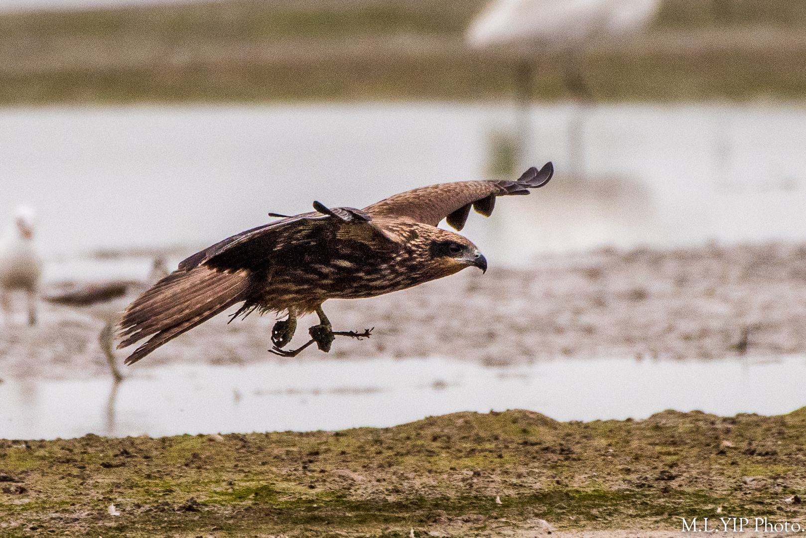 這隻低飛的黑鳶,爪趾間疑似抓著其它雀鳥的殘肢.