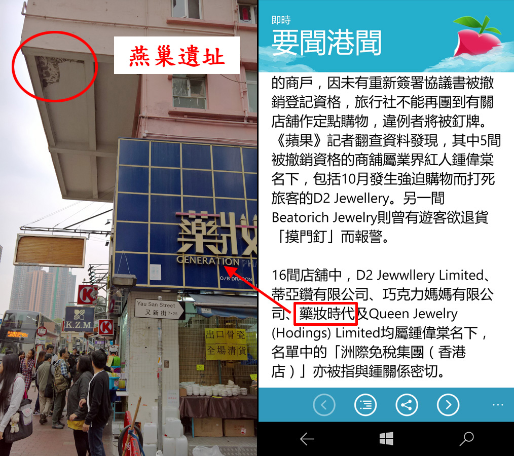 最近該唐樓有地舖進行裝修工程,有目擊街坊指上月二十日早上有人出手毀巢。「佢哋攞住竹枝將十幾個燕巢全部掃落嚟,我已經喝住叫佢哋停手,警告佢哋再唔停手我就報警,不過佢哋無理,結果全部巢就咁剷走,仲搞到成街都係羽毛巢碎。」該名街坊說由於已成定局,故未有再追究。