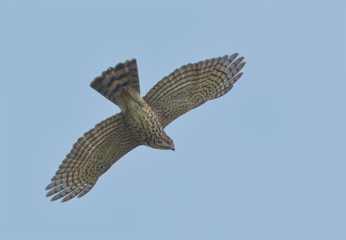 我改变主意,这是日本松雀鹰。尾的深色橫斑比较窄,飞羽的橫斑也比较窄,跟松雀鹰不同。