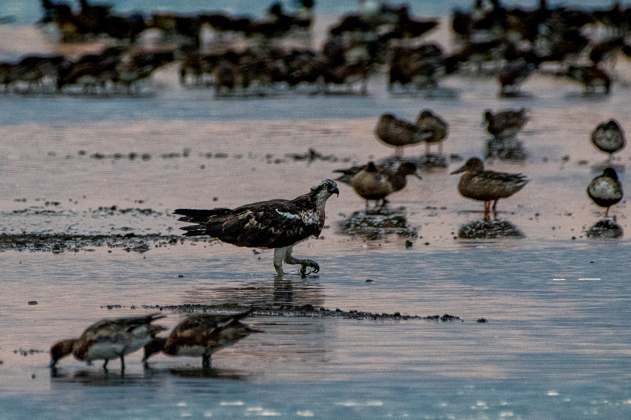 據說猛禽是會攻擊其它的雀鳥, 不過這隻魚鷹在泥灘上踱步, 與鴨群又似和睦共處.