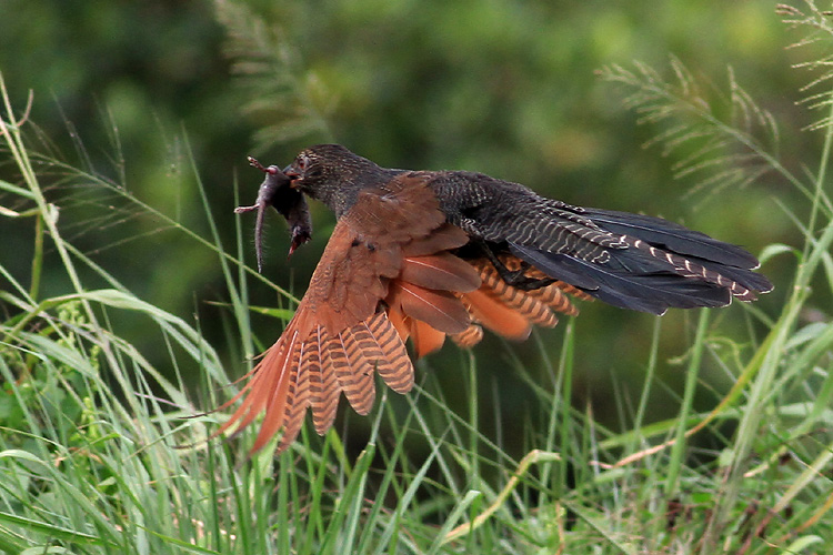 Beautiful capture of a flying Coucal! It seems to have caught a Shrew in its bill.