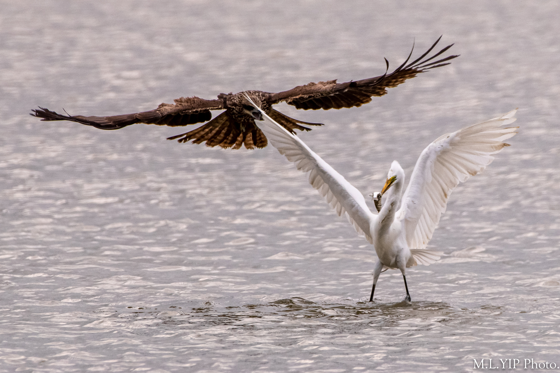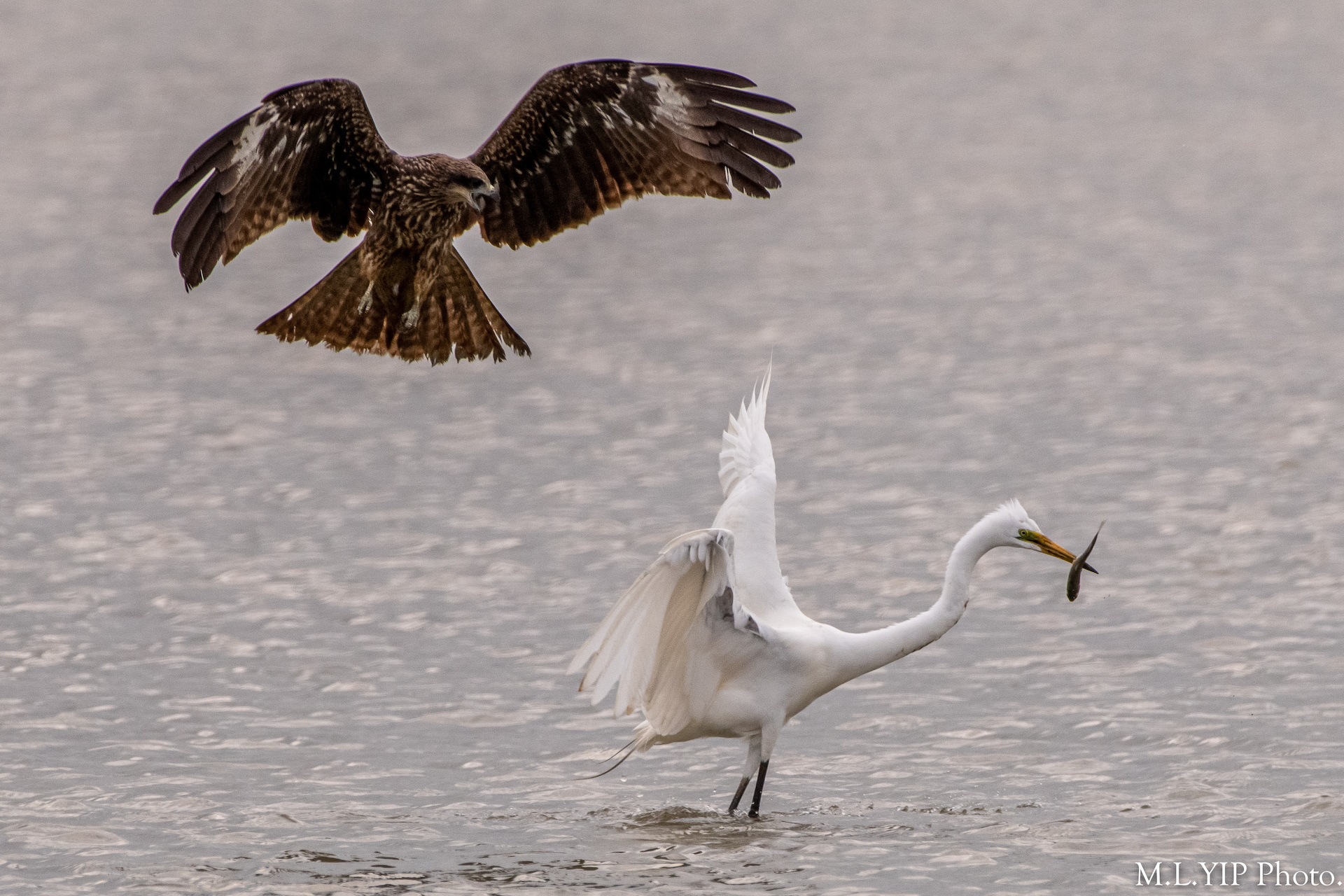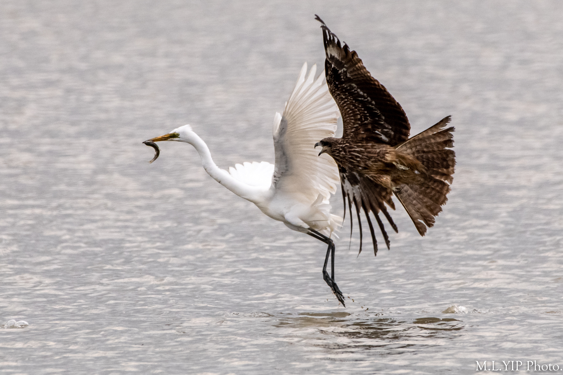 這黑鳶似乎是餓極了,先後向二隻有漁穫的大白鷺進襲,可惜均無功而還.