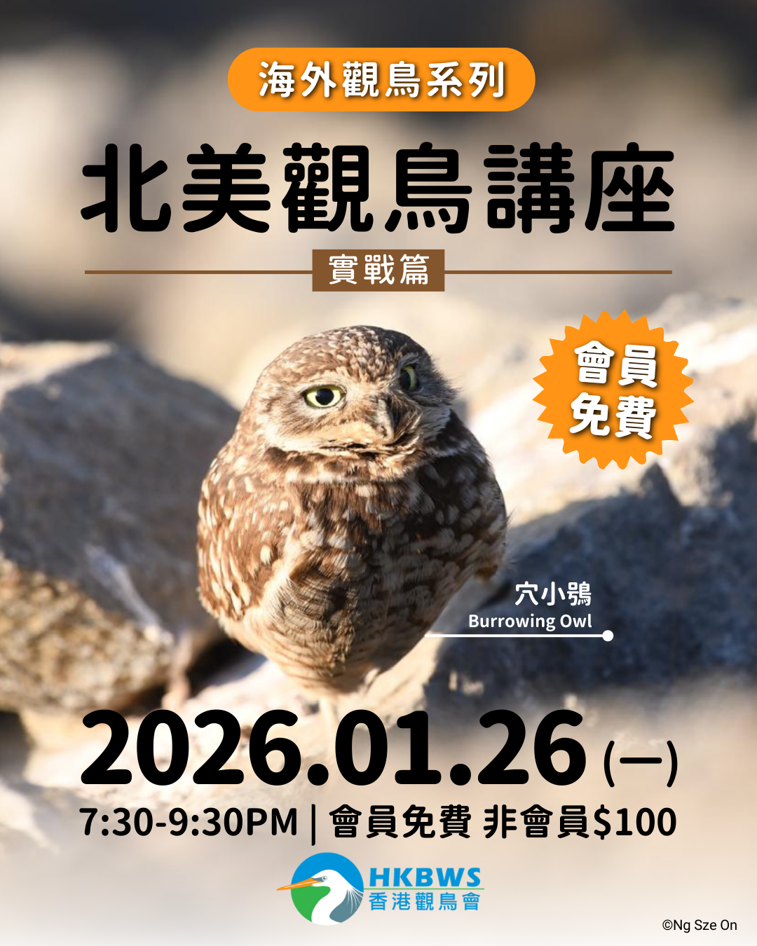 講者將帶大家回顧北美觀鳥旅程中嘅所見所聞,包括點樣追尋 Sage-Grouse 艾草松雞、Mountain Plover 岩鴴等珍貴鳥種,當中既有成功記錄「新tick」嘅興奮時刻,亦有跋山涉水、日曬雨淋嘅辛酸故事!