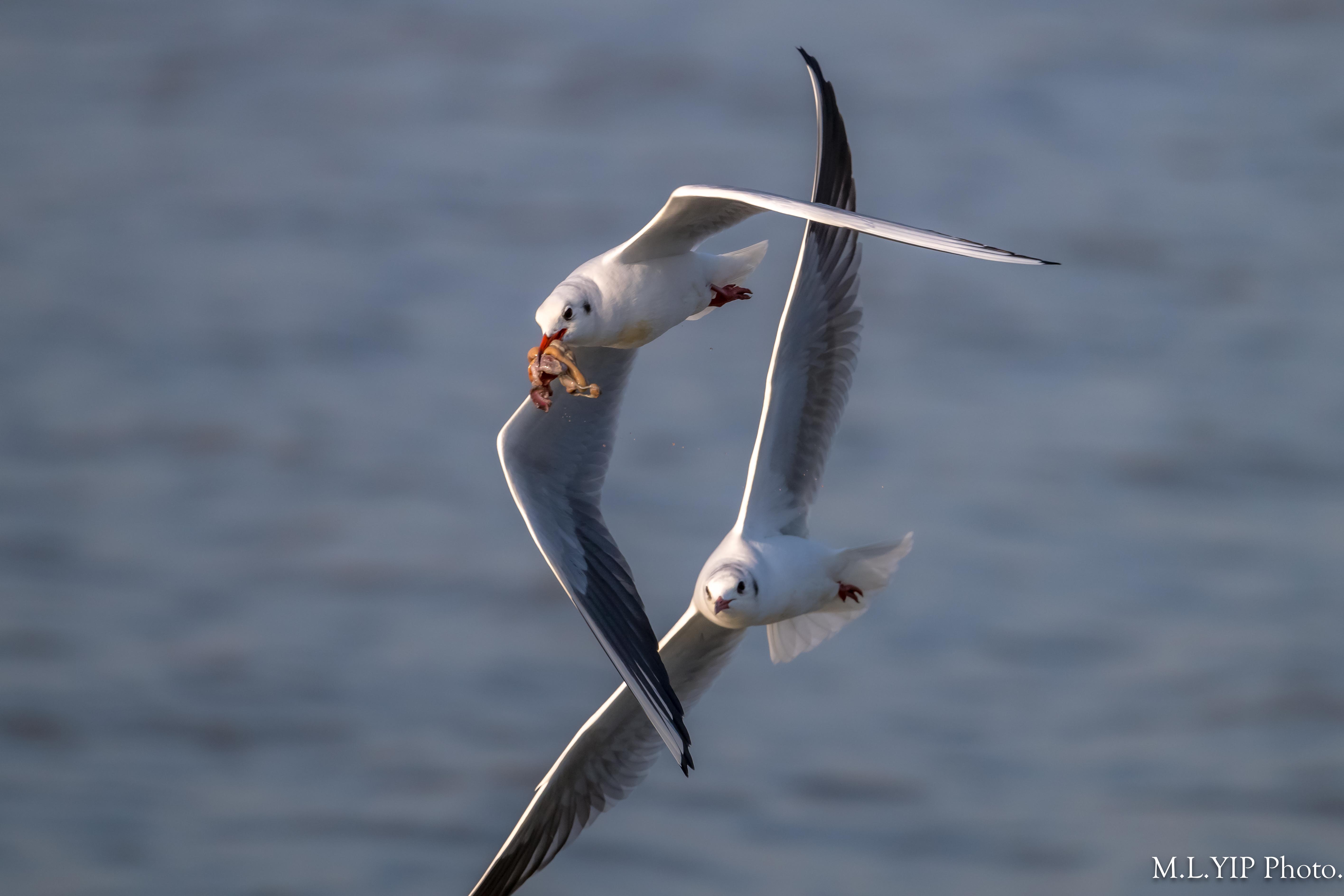 一隻紅嘴鷗撿到食物,另外一隻馬上飛近想搶奪.