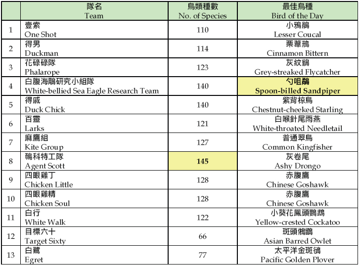 A total of 145 species were recorded by the team "Agent Scott" which made her the winner of the Hong Kong Bird Race 2009. The Best Record is the "Spoon-billed Sandpiper" recorded by the "White-bellied Sea Eagle Team". The President's Choice is also the "Spoon-billed Sandpiper".