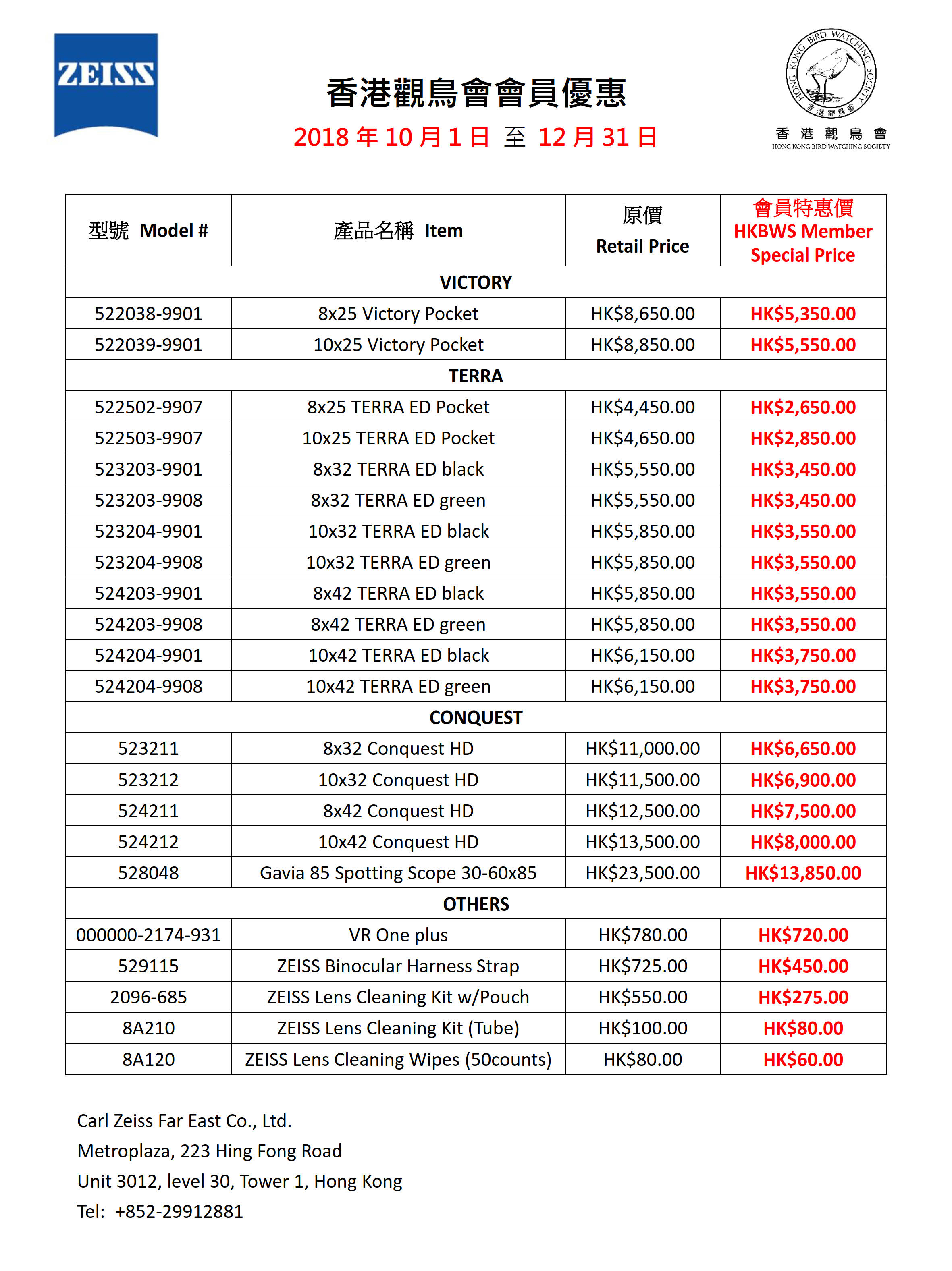 Author: HKBWS Bonnie Time: 12/10/2018 10:47 Subject: ZEISS 望遠鏡優惠 Special Offer of ZEISS Binoculars 2018/10~2018/12