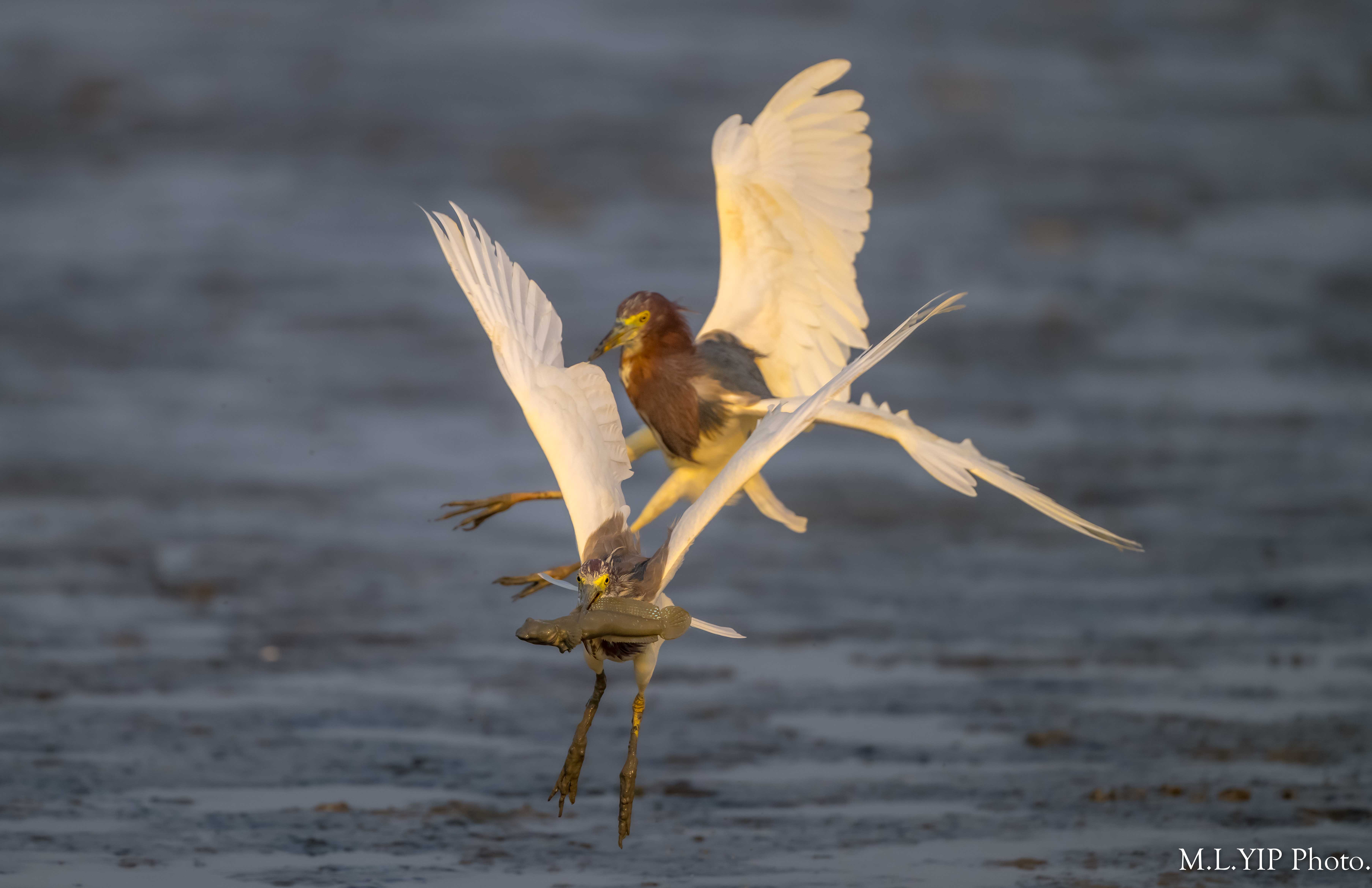 其實池鷺在追逐過程中,早把捕得的彈塗魚吞下.