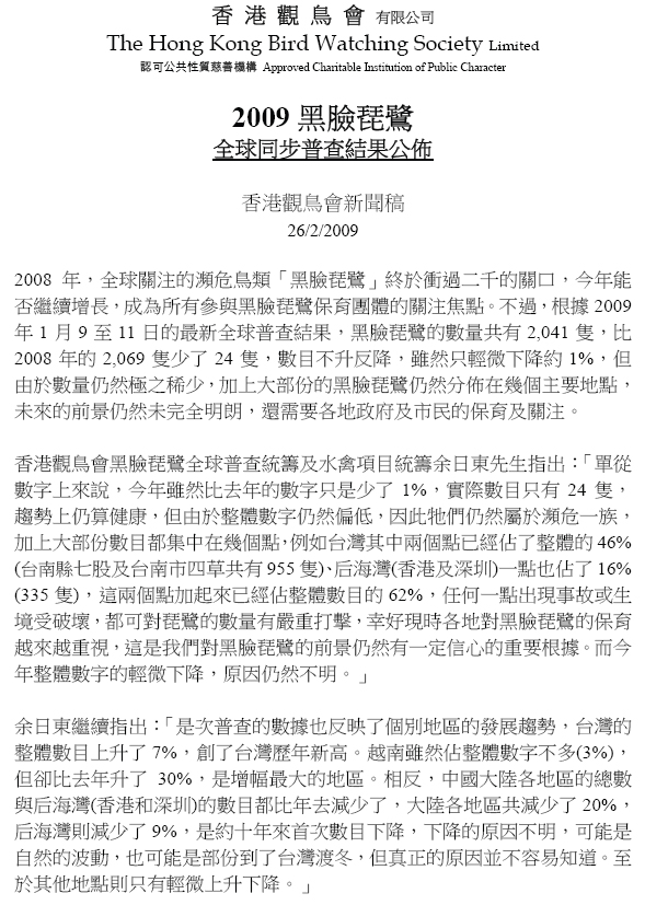 2009黑臉琵鷺 全球普查結果 Results of 2009 Intl BFS Census